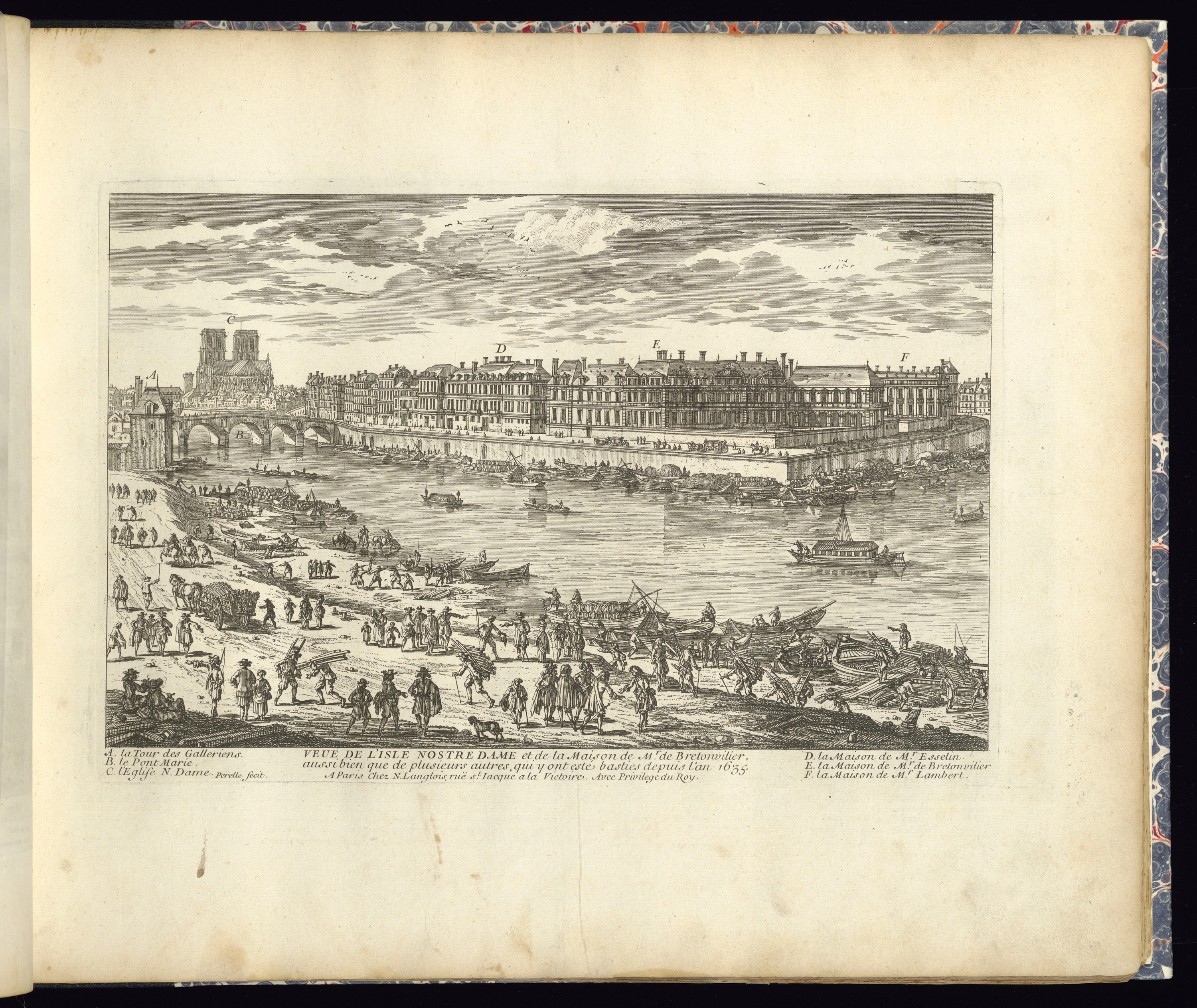 Lettered in plate, lower left: A. la Tour des Galleriens/ B. Le Pont Marie/ C. l’Eglise N. Dame; lettered lower center: VEUE DE L’ISLE NOSTRE DAME et de la Maison de Mr. de Bretonvilier/ aussi bien que de plusieurs autres, qui y ont esté basties depuis l’an 1635; lettered lower right: D. la Maison de Mr Esselin/ E. la Maison de Mr. de Bretonvilier/ F. la Maison de Mr. Lambert.