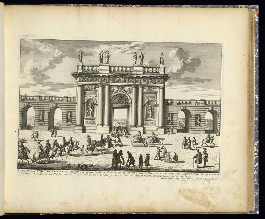 Lettered in plate, lower center: L’ARC ou PORTIQUE DE VINCENNES du côté qui regarde la grande Cour, et par ou l’on entre dans le Parc, est un morceau tres superbe et d’un bon goust d’Ar=/chitecture il fut bâti sous le Ministere du Cardal. Mazarin, par le Sr. le Veau premier Architecte du Roy et embelli de quantité de Statues antiques