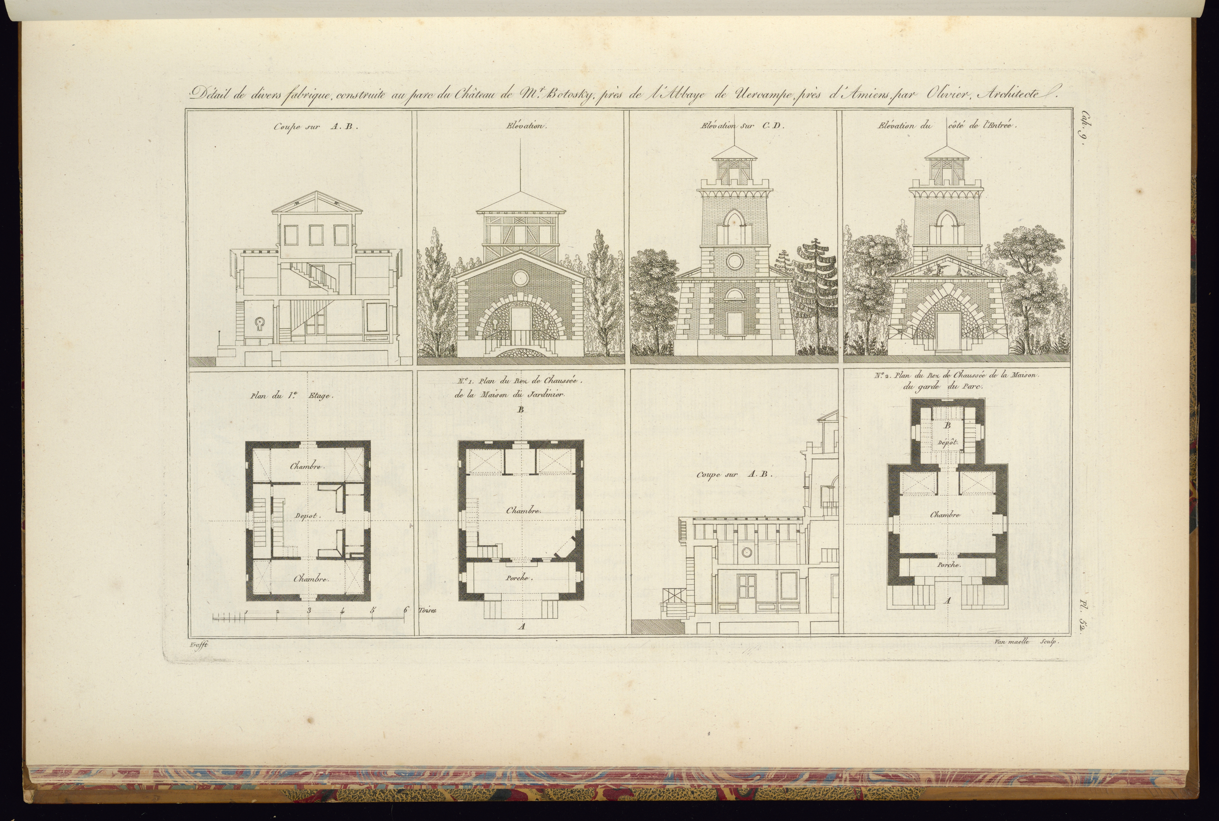 Lettered in plate, upper center: Détail de divers fabrique construite au parc du Château de Mr Botosky, près de l’Abbaye de Vercampe près d’Amiens par Olivier Architecte; lettered upper right corner: Cah. 9; lettered upper left: Coupe sur A.B; lettered upper center: Elévation/ Elévation sur C.D.; lettered upper right: Elévation du côté de l’Entrée; lettered lower left: Plan du 1e Etage; lettered lower center: No. 1 Plan du Rez de Chaussée/ de la Maison du Jardinier/ Coupe sur A.B.; lettered lower right: No.2 Plan du Rez de Chaussée de la Maison/ du garde du Parc; numbered lower right corner: Pl. 52