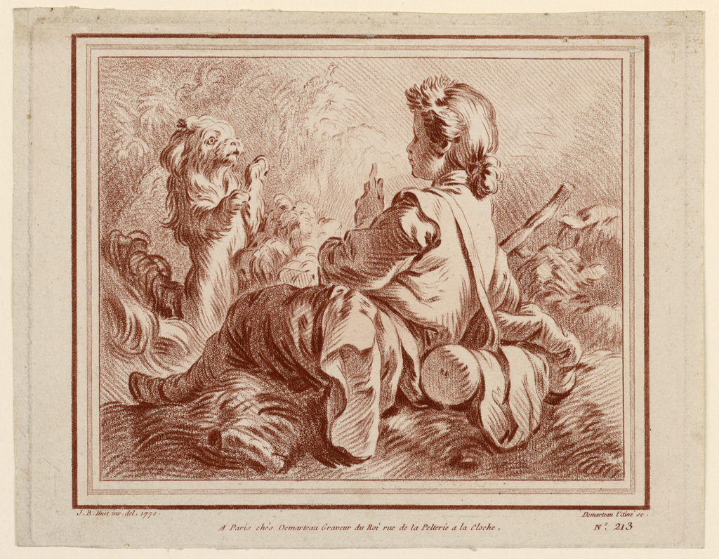 Print, Seated Shepherd Playing with a Dog; Engraved by Gilles Demarteau (Belgian, active in France, 1722 – 1776); After Jean-Baptiste Huët (1745 – 1811), Jean-Baptiste Marie Huet (French, 1745 - 1811); France; crayon manner engraving on heavy cream laid paper; 19.0 x 24.0 cm (7 1/2 x 9 7/16 in. ), plate; 1923-21-2
