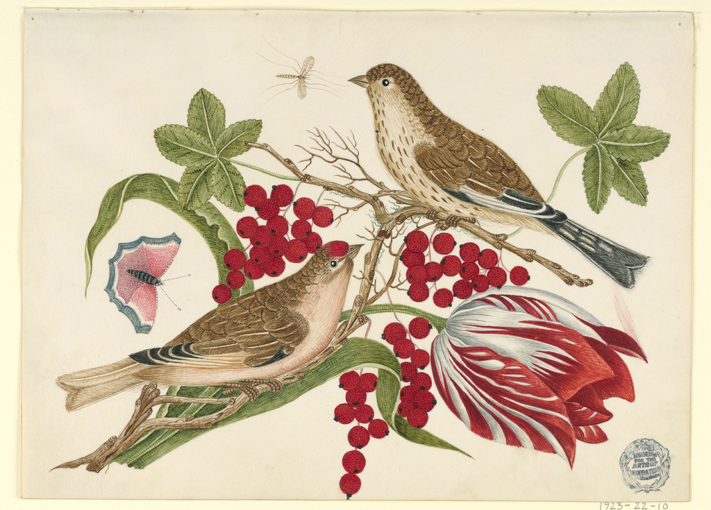 <ref name=CH>{{cite web |url=https://www-5.collection.cooperhewitt.org/objects/18299413/ |title=Drawing, Brown Bird on Branch with Rose, Tulip, and Insects |author=Cooper Hewitt, Smithsonian Design Museum |accessdate=19 December 2025 |publisher=Smithsonian Institution}}</ref>
