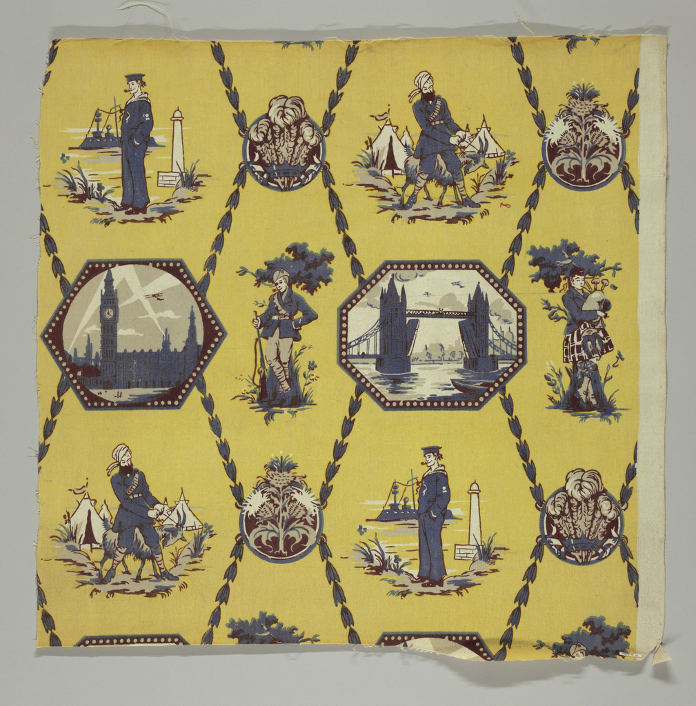 This is a Textile. It is dated ca. 1917 and we acquired it in 1923. Its medium is cotton and its technique is printed on plain weave. It is a part of the Textiles department.
