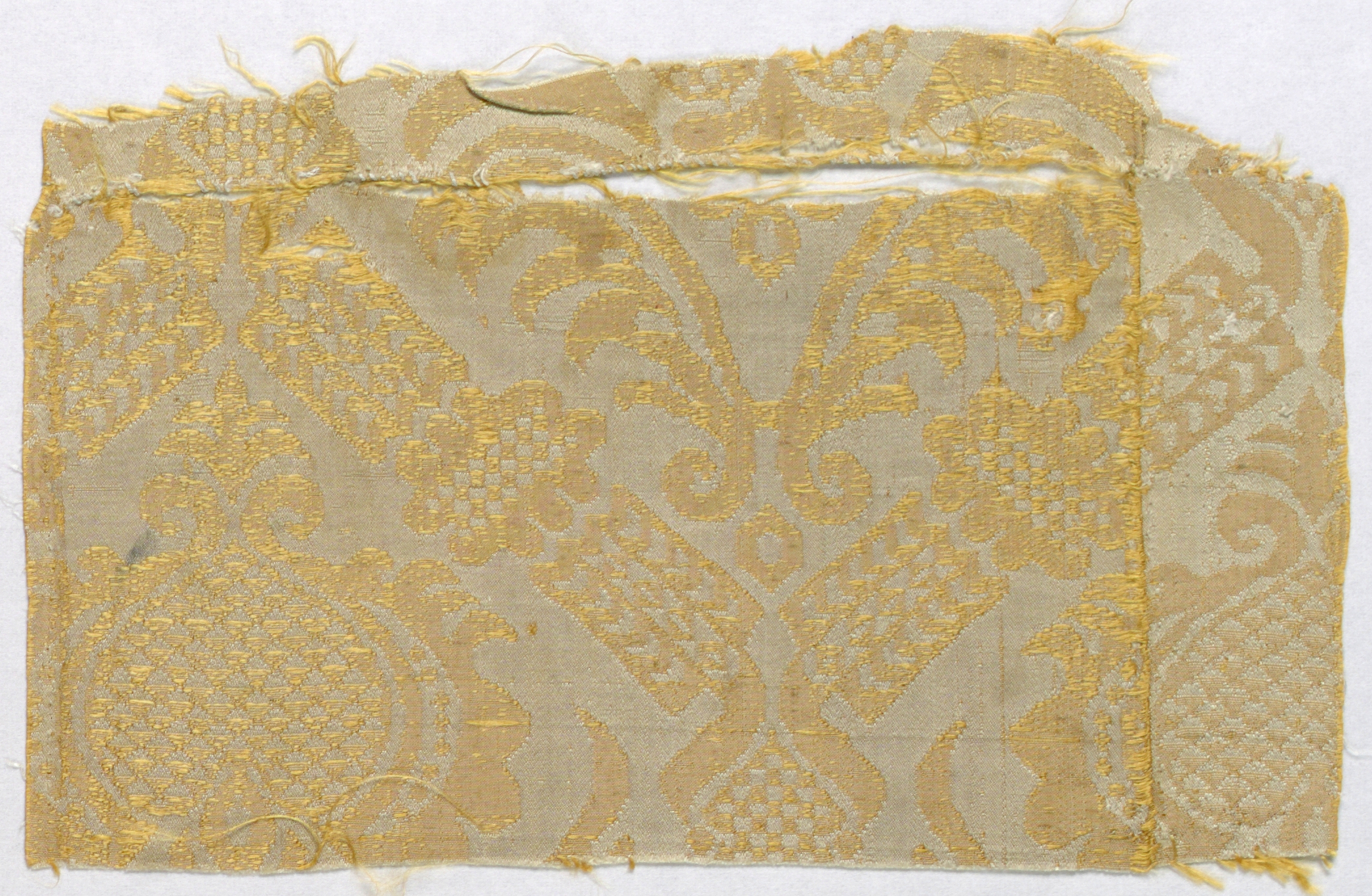 This is a Fragment. It is dated 17th century and we acquired it in 1923. Its medium is silk and its technique is damask. It is a part of the Textiles department.