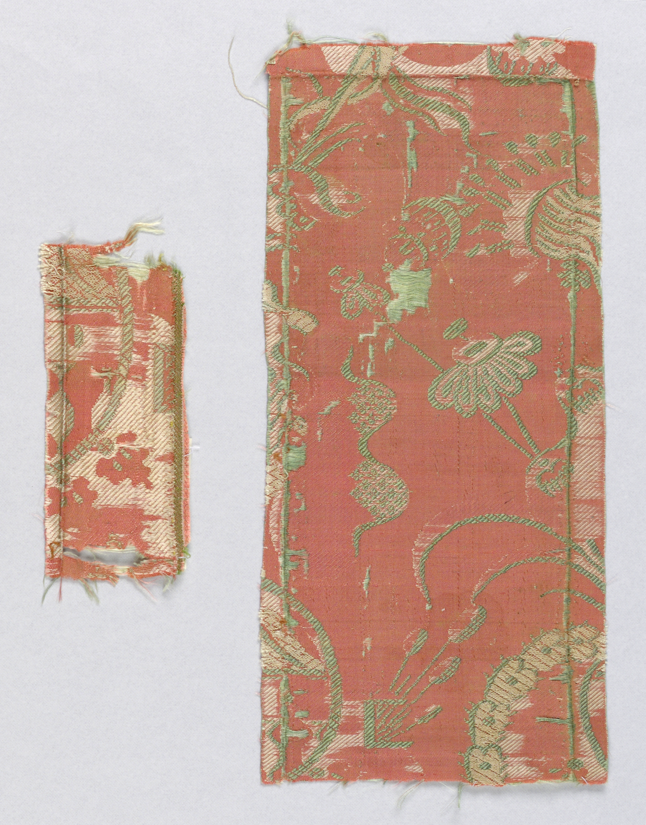 This is a Fragment. It is dated late 18th century and we acquired it in 1923. Its medium is silk and its technique is compound twill with discontinuous supplementary weft patterning (brocade). It is a part of the Textiles department.