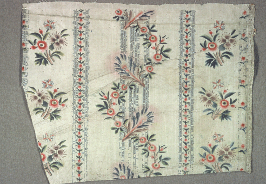 This is a Fragment. It is dated late 18th century and we acquired it in 1923. Its medium is silk, metal threads, some paint and its technique is plain weave with discontinuous supplementary weft patterning (brocade). It is a part of the Textiles department.
