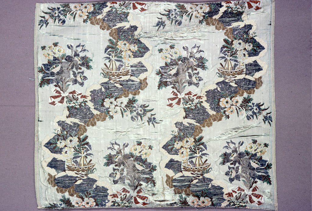 This is a Fragment. It is dated late 18th century and we acquired it in 1923. Its medium is silk, metal thread and its technique is plain weave with discontinuous supplementary weft patterning (brocade). It is a part of the Textiles department.
