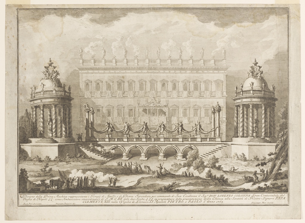Print, The temples of Apollo and Diana built for the first day of the fireworks at SS. Peter and Paul by Paolo Posi