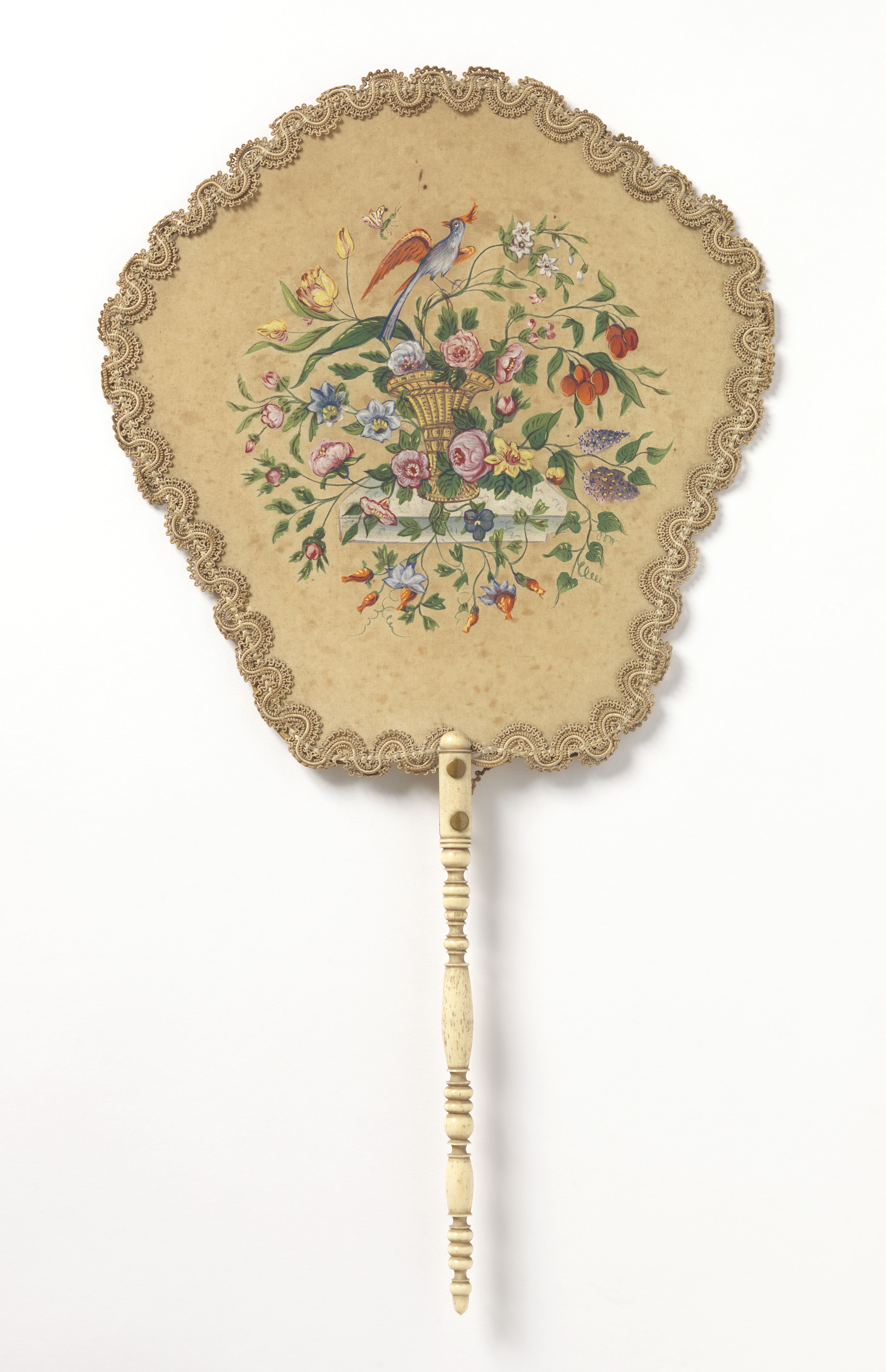 This is a Handscreen. It is dated late 18th century and we acquired it in 1924. Its medium is hand-painted silk leaf with passementerie, turned ivory handle. It is a part of the Textiles department.