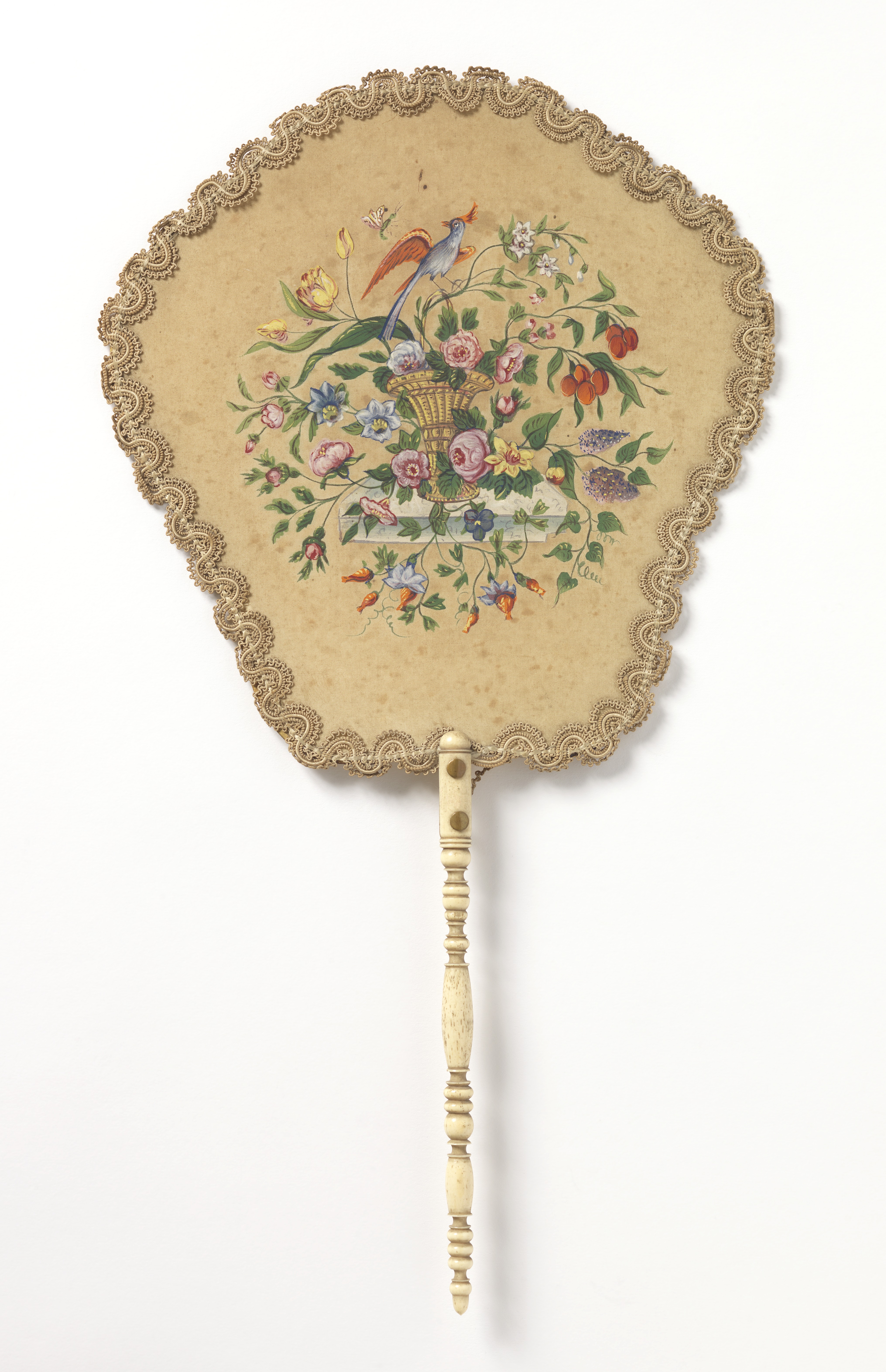 This is a Handscreen. It is dated late 18th century and we acquired it in 1924. Its medium is hand-painted silk leaf with passementerie, turned ivory handle. It is a part of the Textiles department.