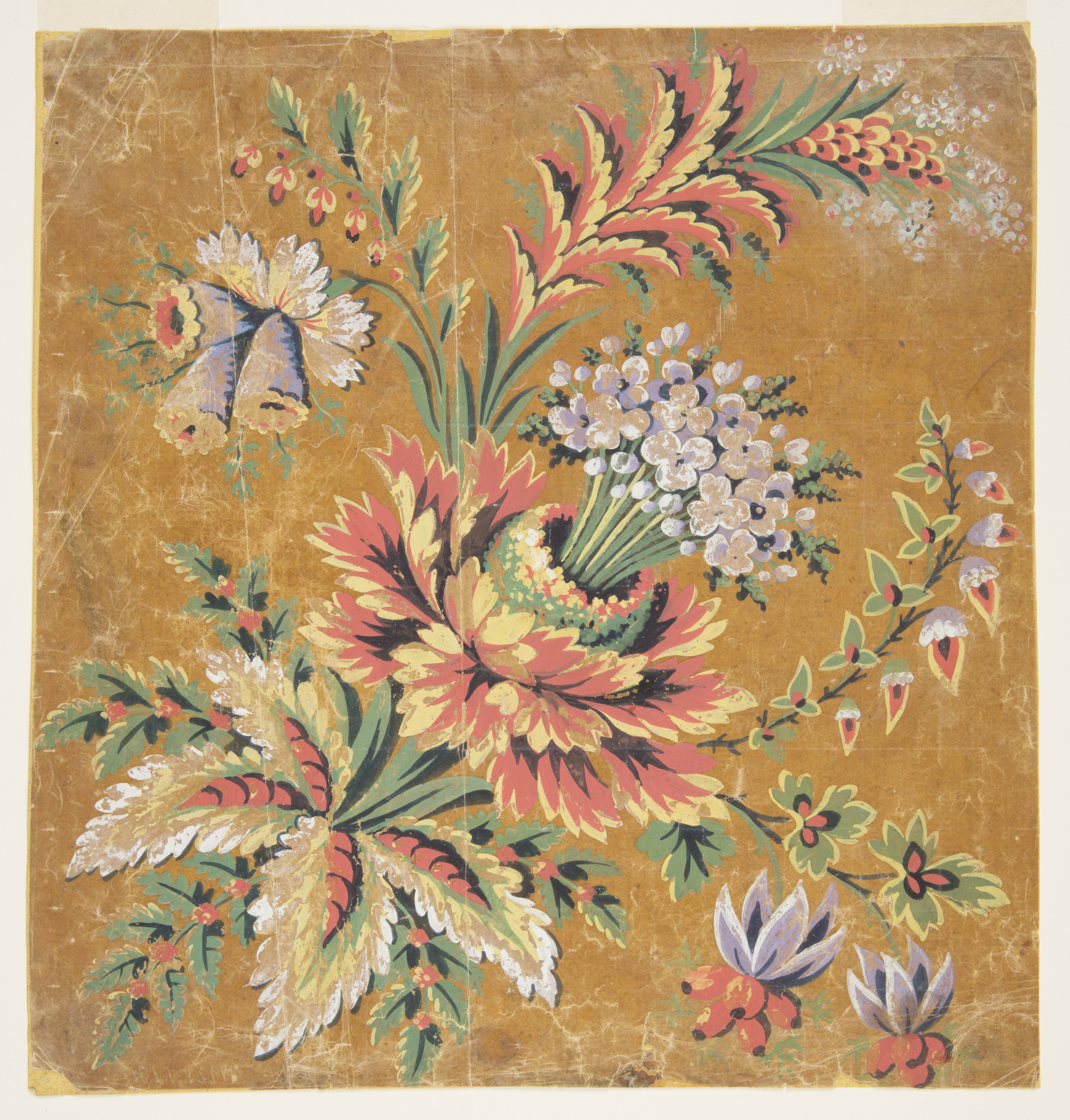 The exuberant and explosive power of this large-scale floral design perfectly illustrates how designers approached flowers, making them active rather than passive forms of ornamentation. Skilled embroiderers retained the same essence of vitality in their needlework for waistcoats.