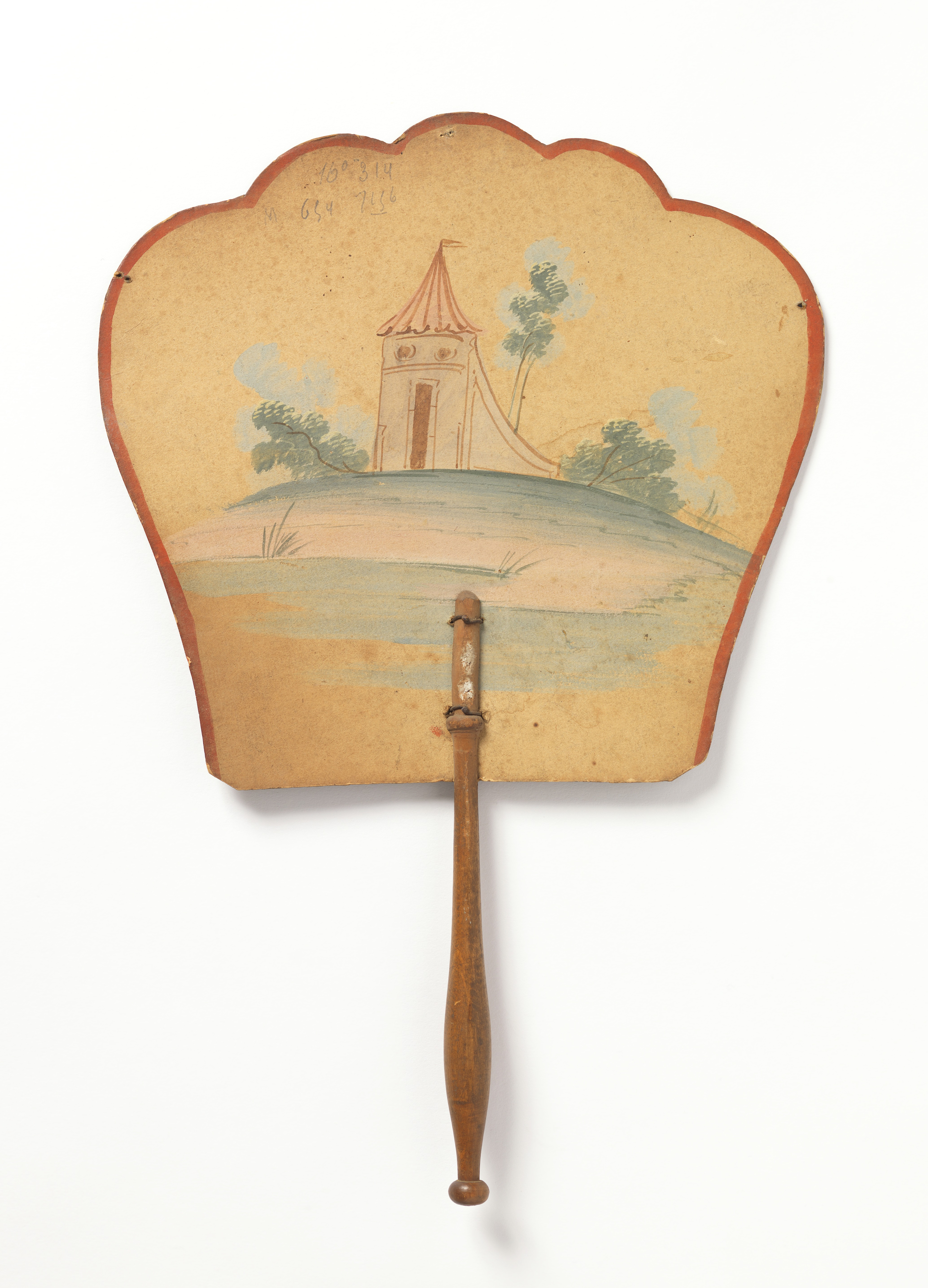 This is a Handscreen. It is dated 18th century and we acquired it in 1925. Its medium is painted paper leaf, turned wood handle. It is a part of the Textiles department.