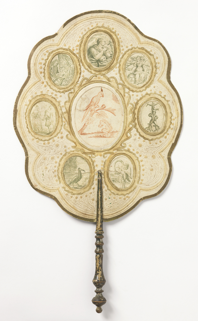 This is a Handscreen. It is dated early 18th century and we acquired it in 1925. Its medium is engraved paper leaf, turned and painted wood handle . It is a part of the Textiles department.