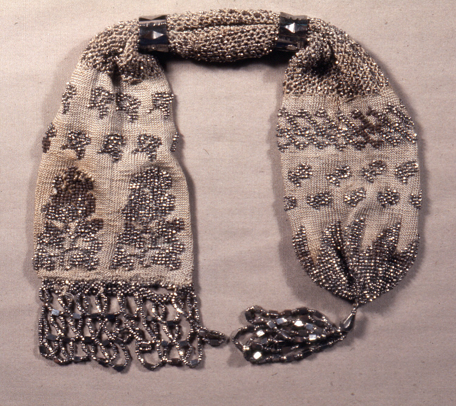 This is a Miser's purse. It is dated 1850–90 and we acquired it in 1925. Its medium is silk, steel beads and its technique is knitted in crossed and uncrossed stockinette and openwork stitches. It is a part of the Textiles department.