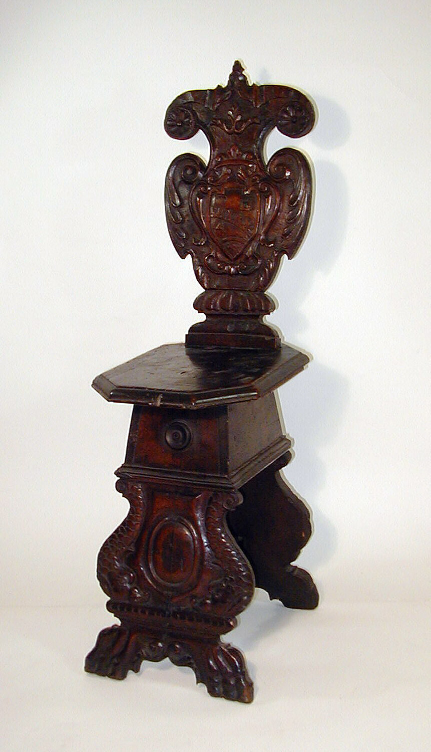 This is a side chair. It is dated 16th century and we acquired it in 1926. Its medium is carved walnut wood. It is a part of the Product Design and Decorative Arts department.