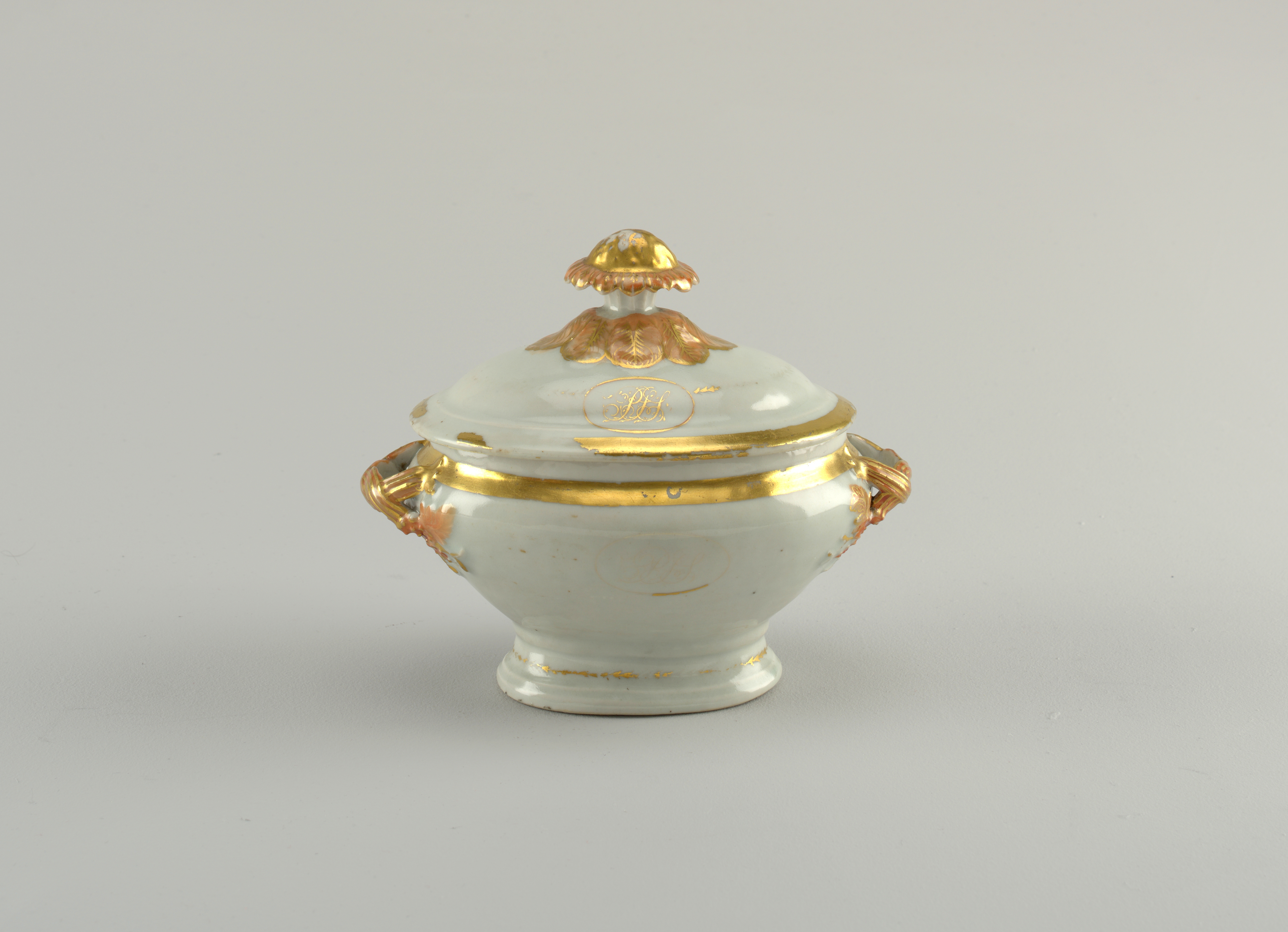 This is a tureen. It is dated late 18th century and we acquired it in 1926. Its medium is porcelain, gold. It is a part of the Product Design and Decorative Arts department.