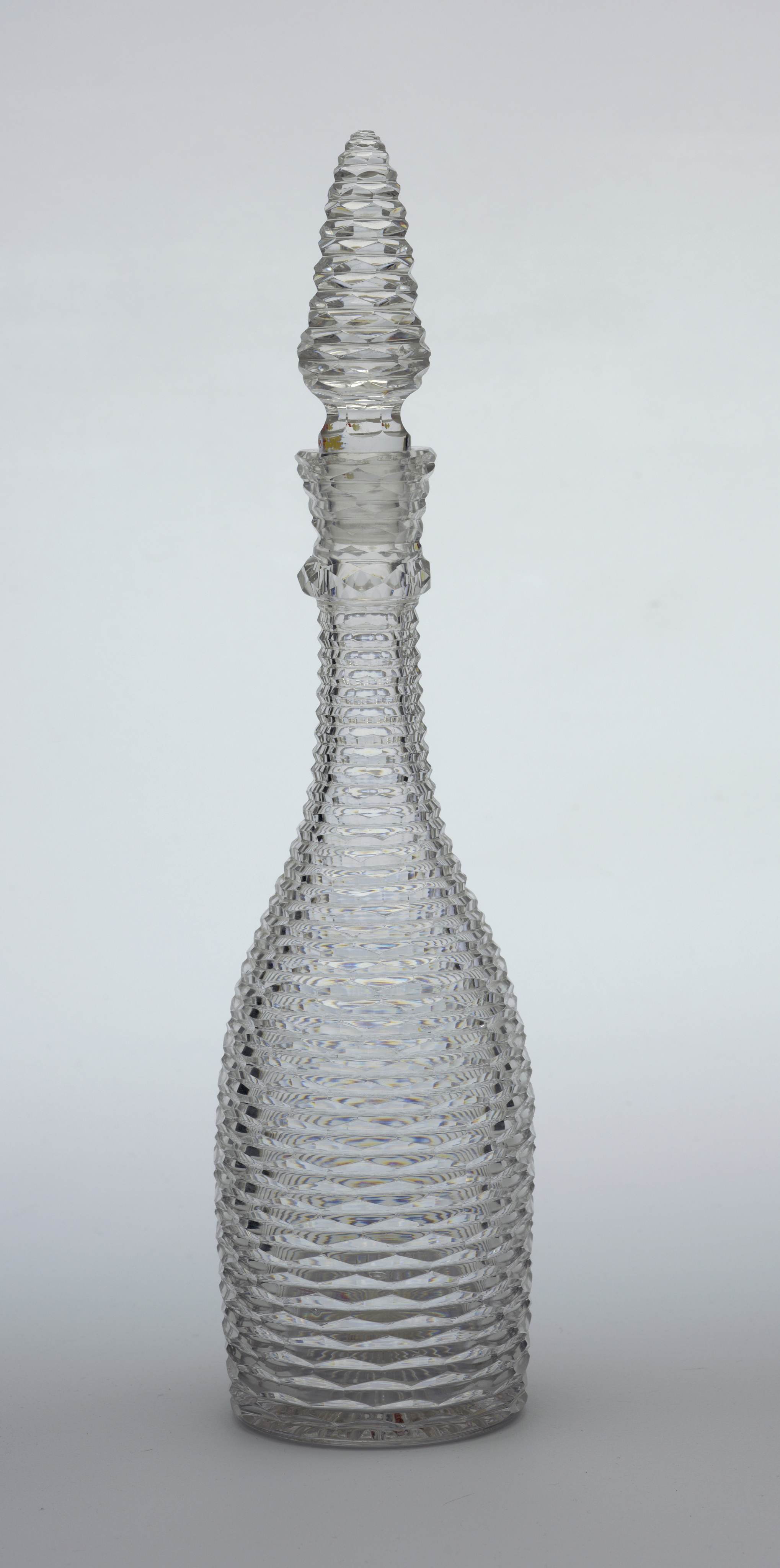 This is a Decanter and stopper. It is dated 1801–50 and we acquired it in 1926. Its medium is cut blown glass. It is a part of the Product Design and Decorative Arts department.