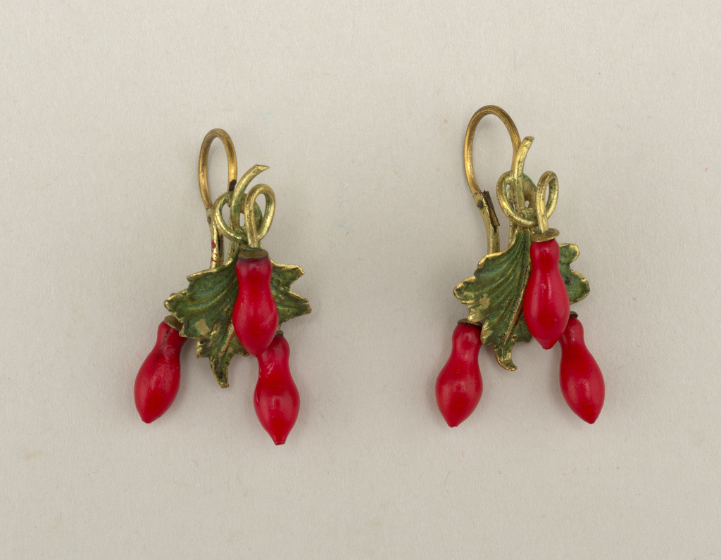 This is a earrings. We acquired it in 1927. Its medium is gold, red stained ivory, enamel. It is a part of the Product Design and Decorative Arts department.