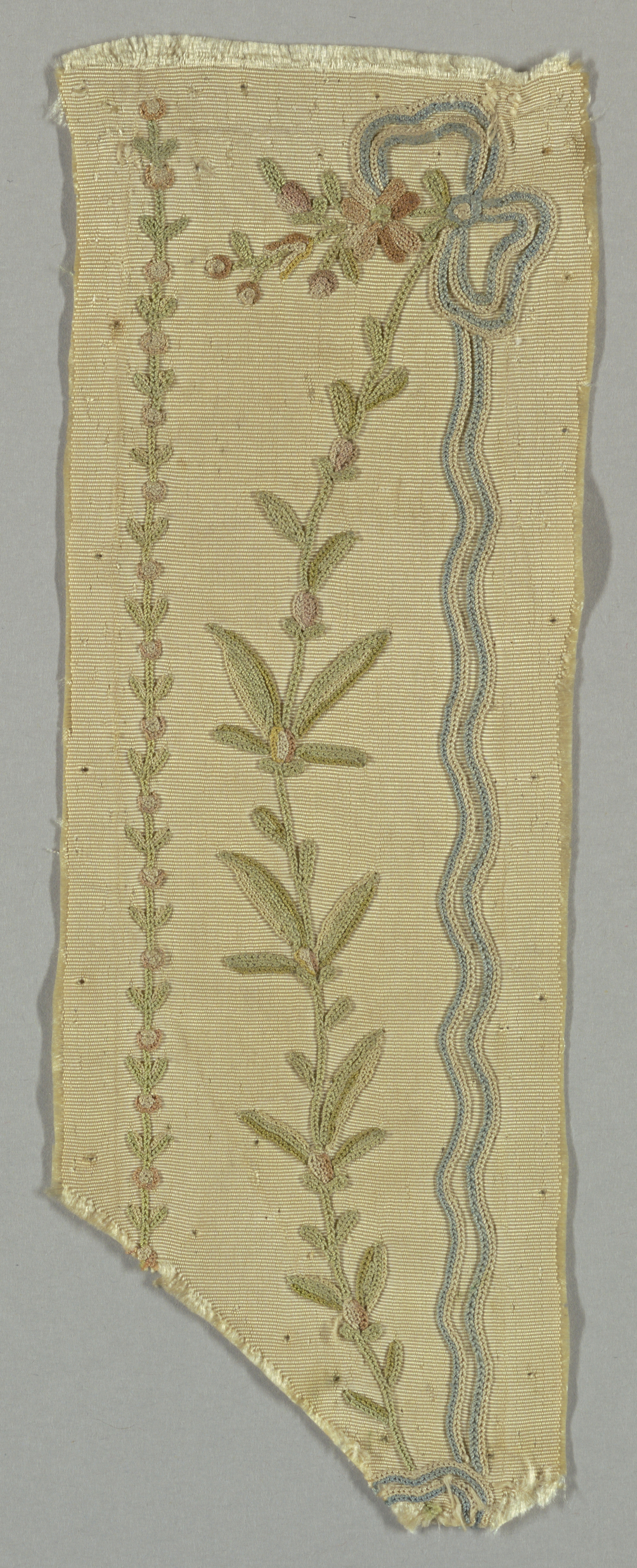This is a Textile. It is dated ca. 1780 and we acquired it in 1928. Its medium is silk on silk and its technique is chain stitch embroidery. It is a part of the Textiles department.