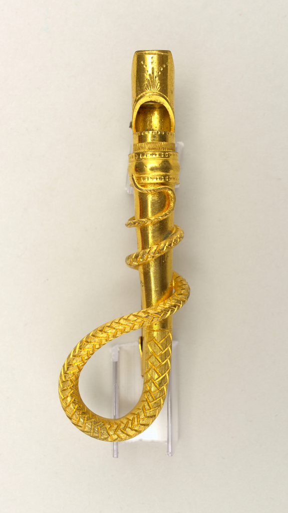 This is a brooch. It is dated late 19th century and we acquired it in 1928. Its medium is brooch in design of a whistle made from a whip.. It is a part of the Product Design and Decorative Arts department.
