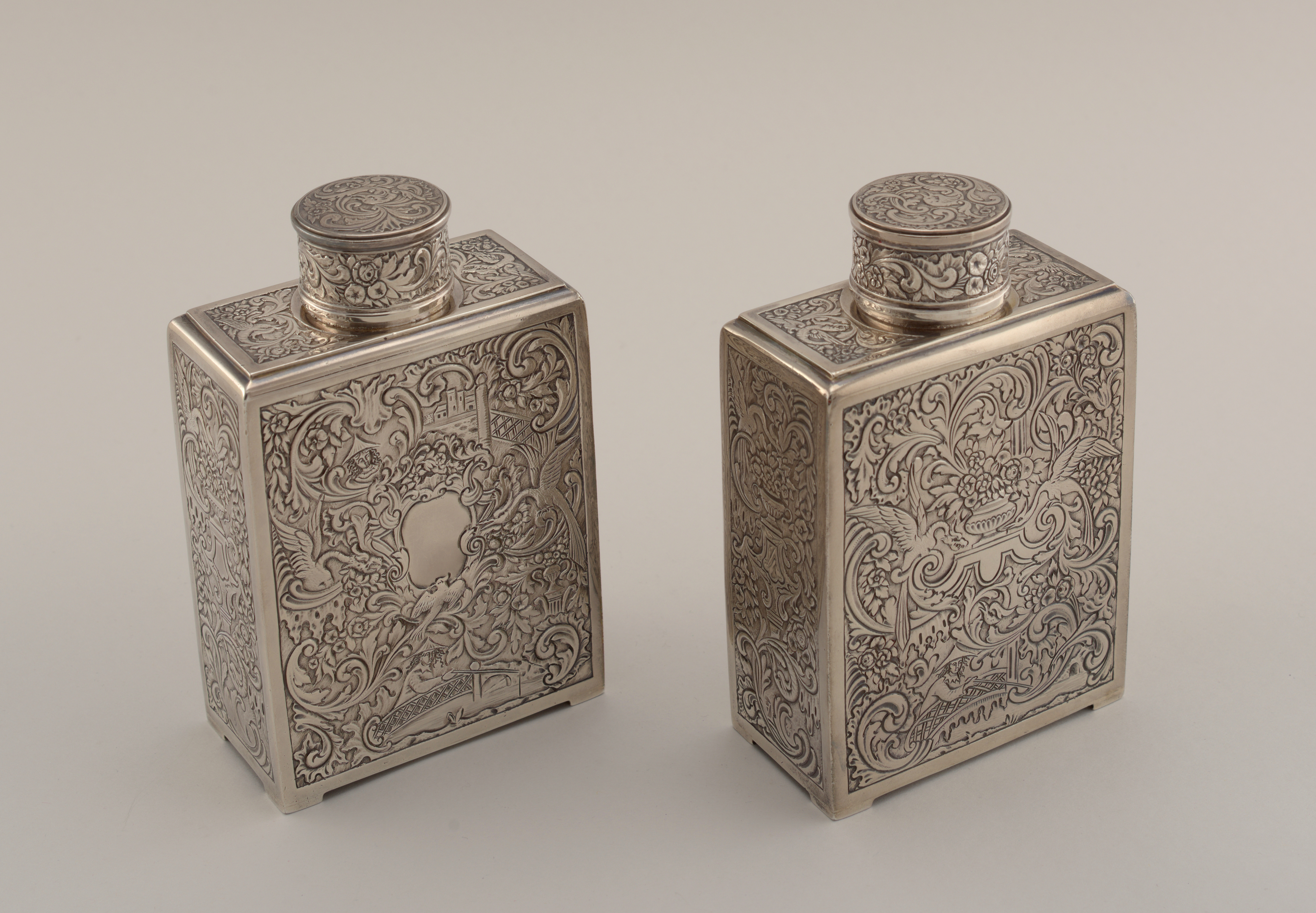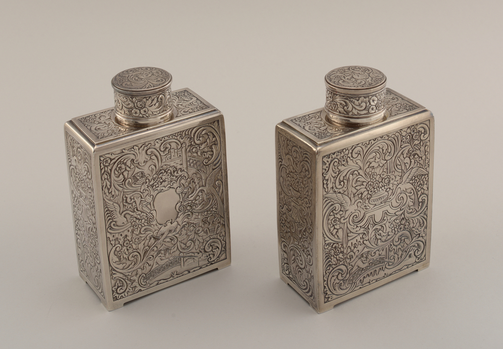 On underside of the caddy: [1] “P.A.” under a peacock, impressed (maker’s mark) [2] “A.D 1716”, incised (date) [3] lion's head erased, impressed (London assay mark for Britannia silver standard) [4] “01”, incised On one side, within foliate scroll at bottom: [1] Britannia, impressed (Britannia silver standard mark, compulsory between 1687 and 1720, mark partially effaced) On one side, within foliate scroll at bottom: [1] “A” in shield reserve, impressed (London date letter for 1716; mark partially effaced) Interior of caddy cover: [1] “P.A.” under a peacock, impressed (maker’s mark) [2] lion's head erased, impressed (London assay mark for Britannia silver standard; stamped over maker's mark)