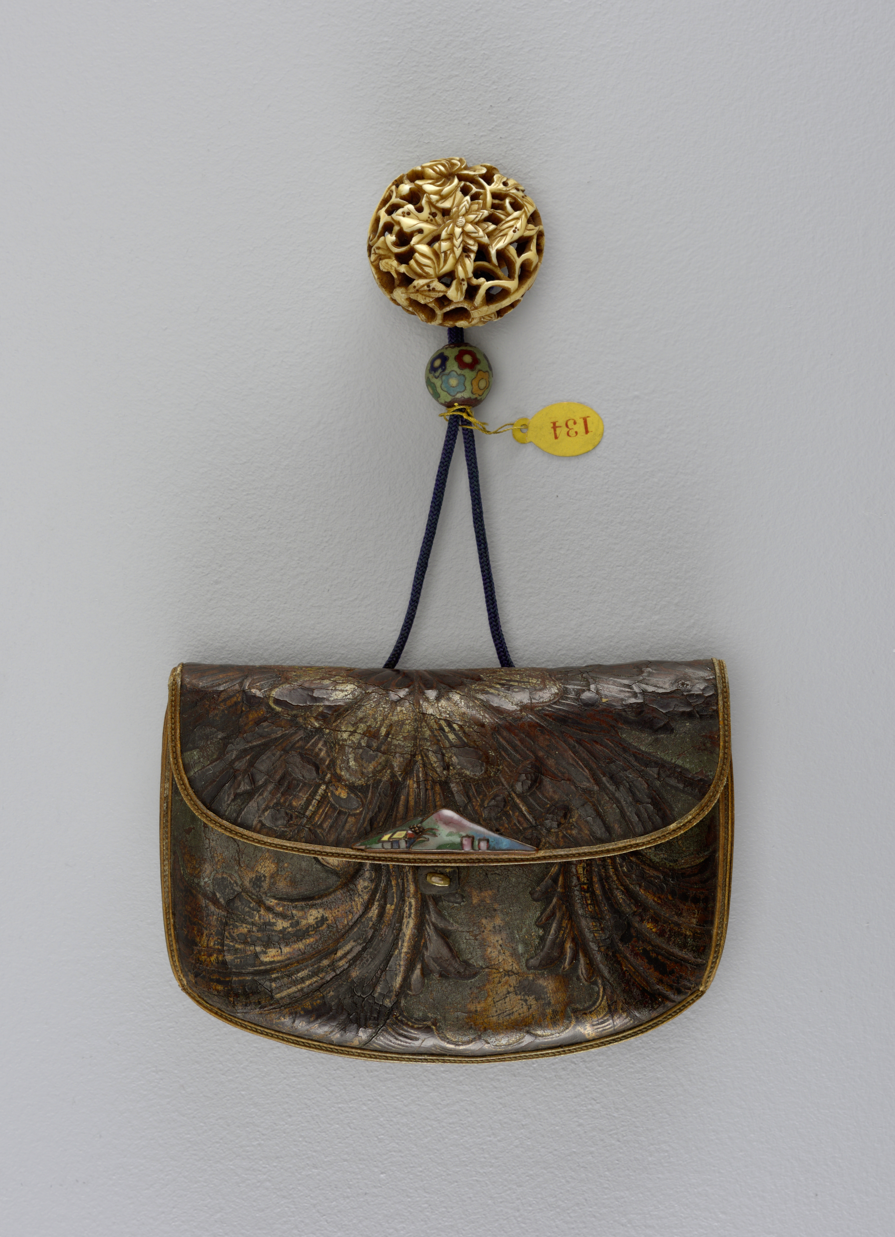 This is a Kin-chaku (purse) with netsuke and ojime on chord . It is dated ca. 1750 and we acquired it in 1931. Its medium is leather (purse); ivory and shibuichi (netsuke), enamel on copper, silk (cord). It is a part of the Product Design and Decorative Arts department.