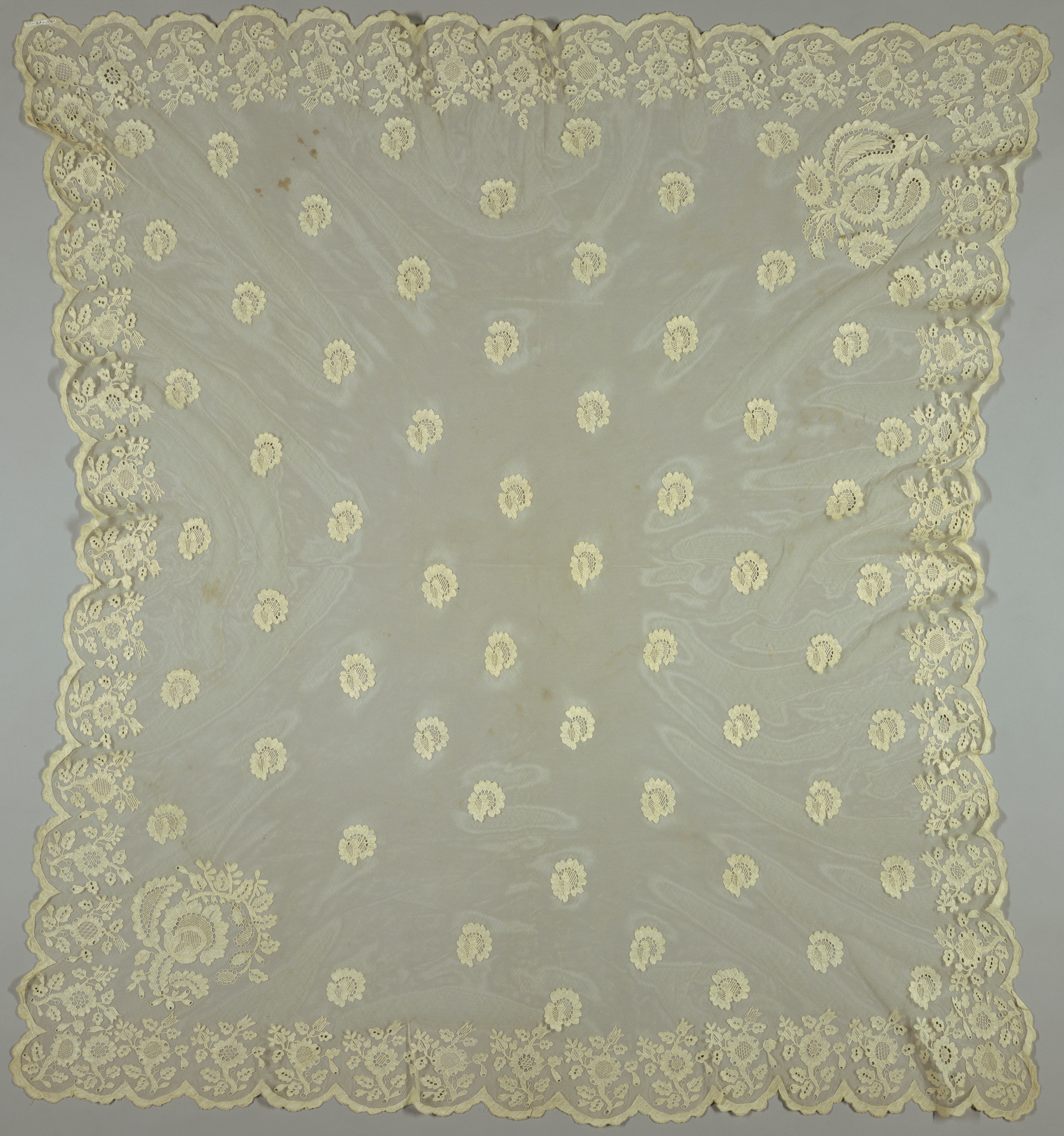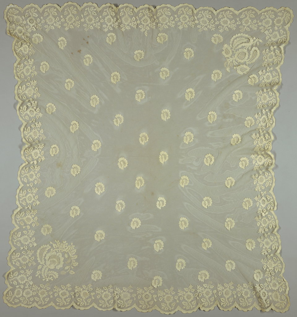 This is a Veil. It is dated 19th century and we acquired it in 1931. Its medium is linen and its technique is needlework on net. It is a part of the Textiles department.