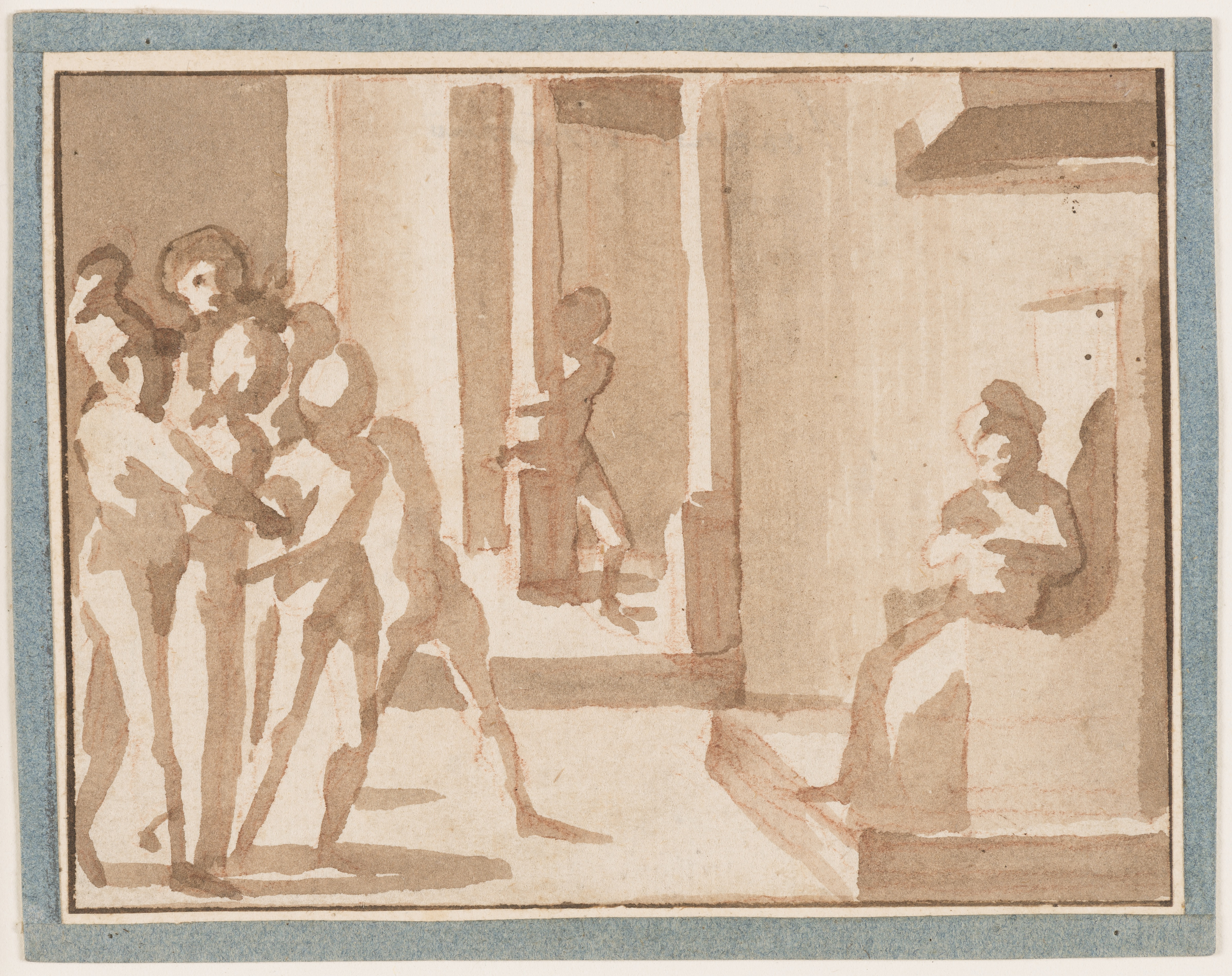 Drawing, Christ before Caiphas; Jan van der Straet, called Stradanus (Flemish, 1523–1605); Netherlands; red crayon, brush and bistre wash on paper; 9.4 × 12.5 cm (3 11/16 × 4 15/16 in.); Gift of Eleanor and Sarah Hewitt; 1931-64-183