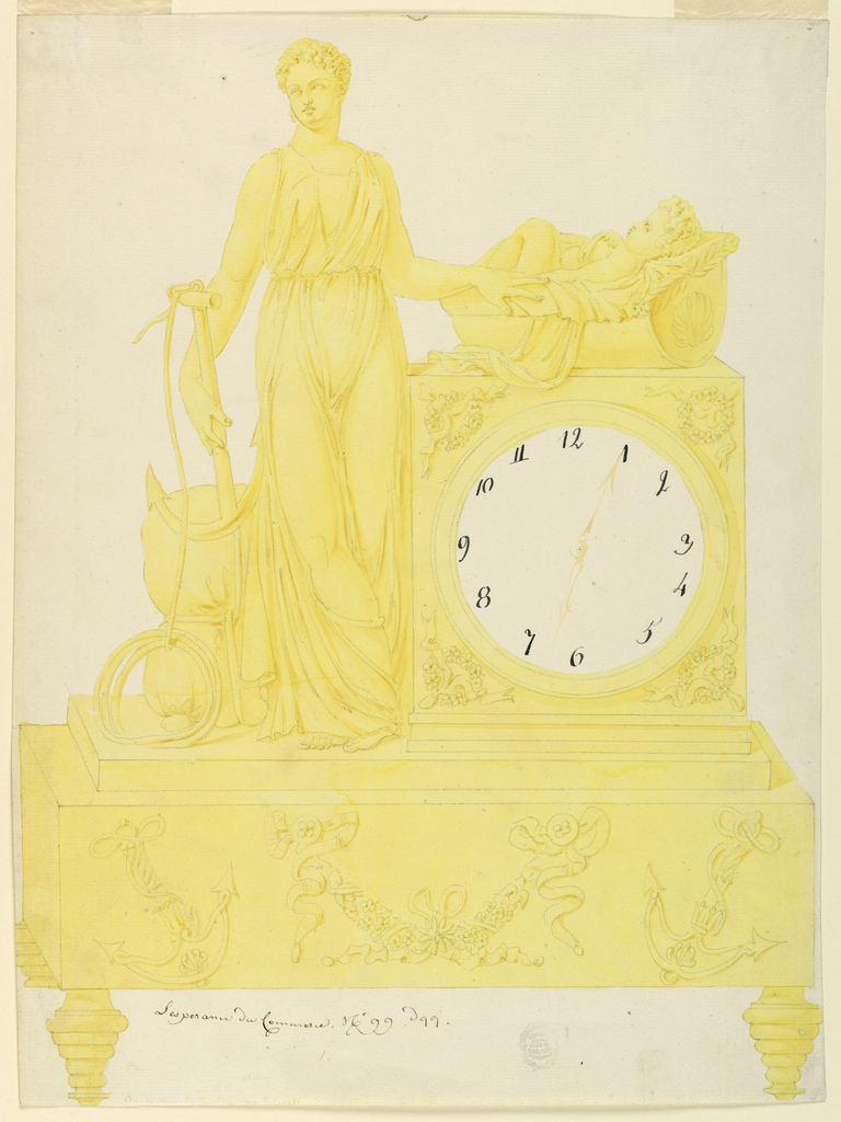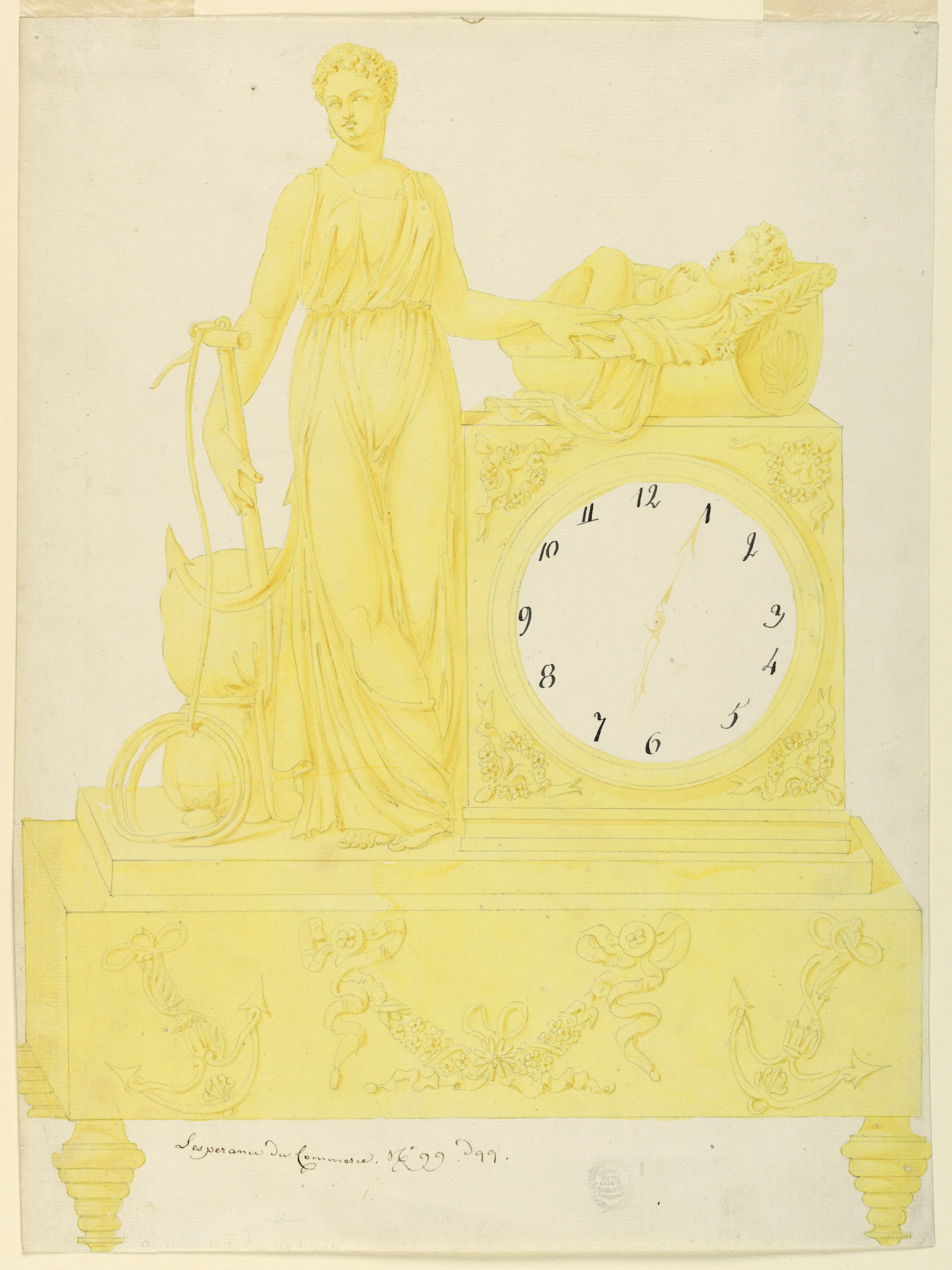 Drawing, Design for Clock; Manufactured by Lefebvre Manufactory, Tournai; Belgium; graphite, pen and black ink, brush and yellow, red watercolor on cream laid paper; 39.5 x 29.4 cm (15 9/16 x 11 9/16 in.); Gift of Eleanor and Sarah Hewitt; 1931-71-16