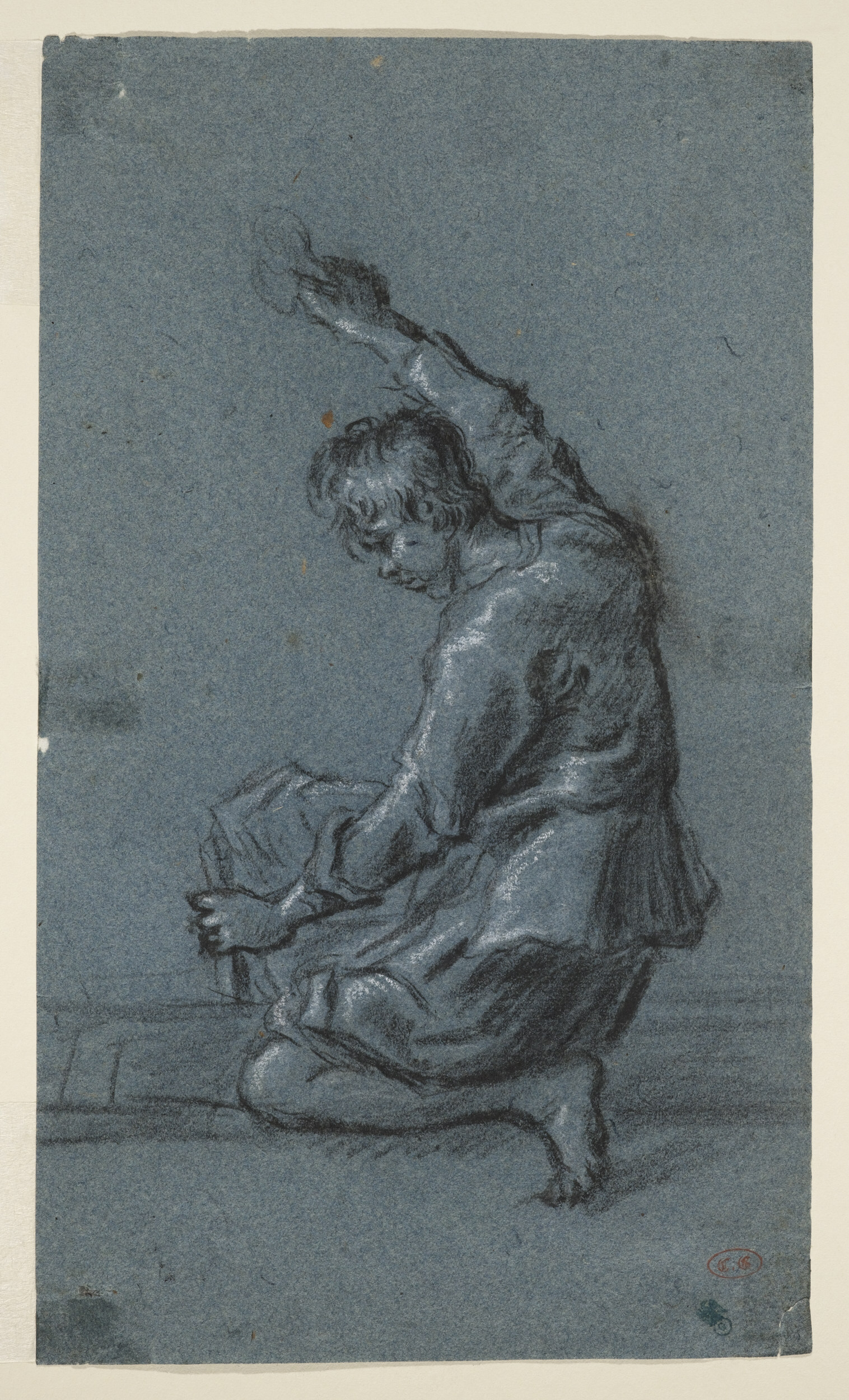 Drawing, Study of a Boy Carpenter; Netherlands; black and white crayon on grayish-blue laid paper; 26.3 x 15.4 cm (10 3/8 x 6 1/16 in.); Gift of Eleanor and Sarah Hewitt; 1931-71-49