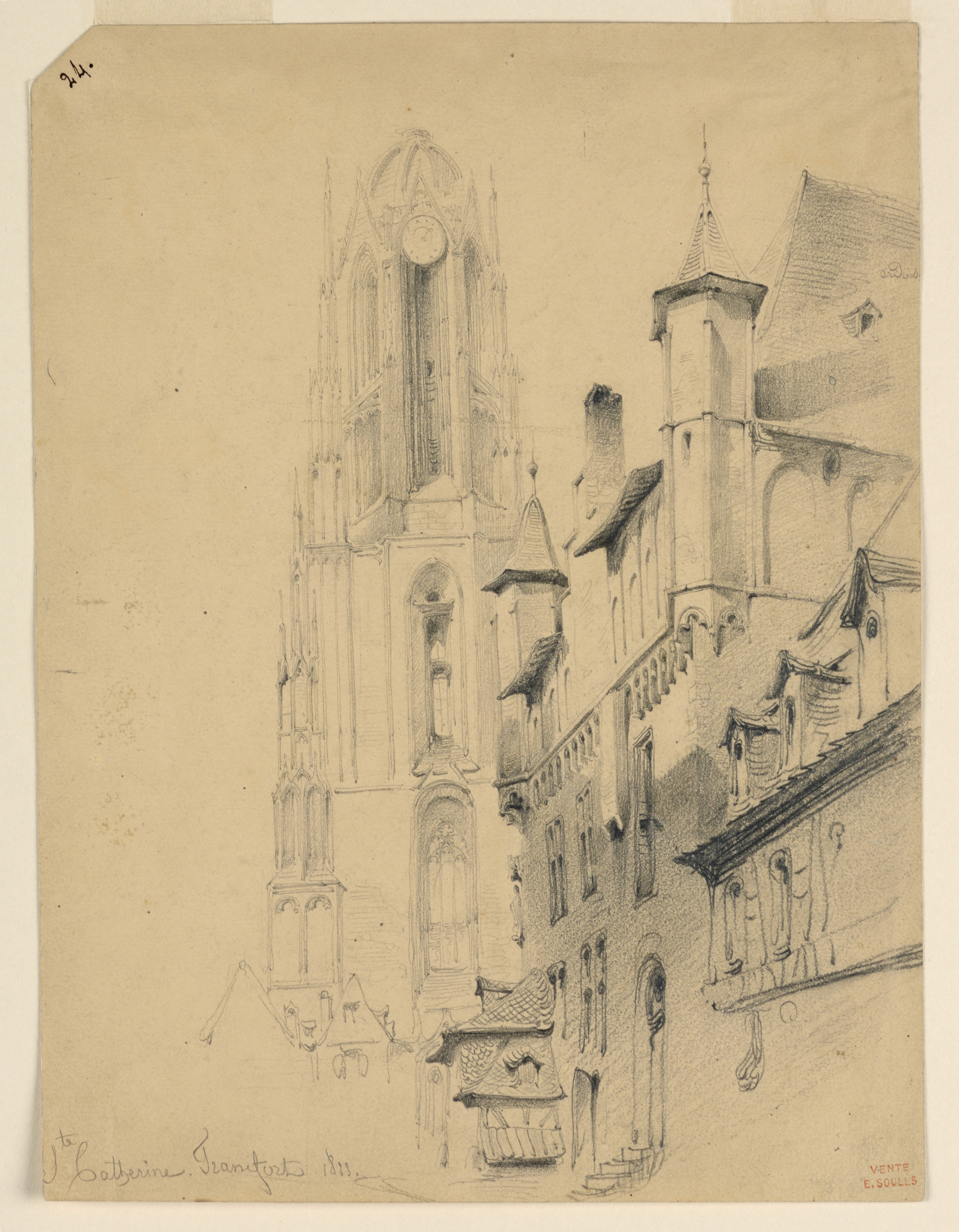 Drawing, Saint Catherine in Frankfurt am Main, Germany; Eugène Edouard Soulès (French, 1811–1876); France; graphite, black crayon on light creamy paper; 22.1 × 29.5 cm (8 11/16 × 11 5/8 in.); Gift of Eleanor and Sarah Hewitt; 1931-73-182