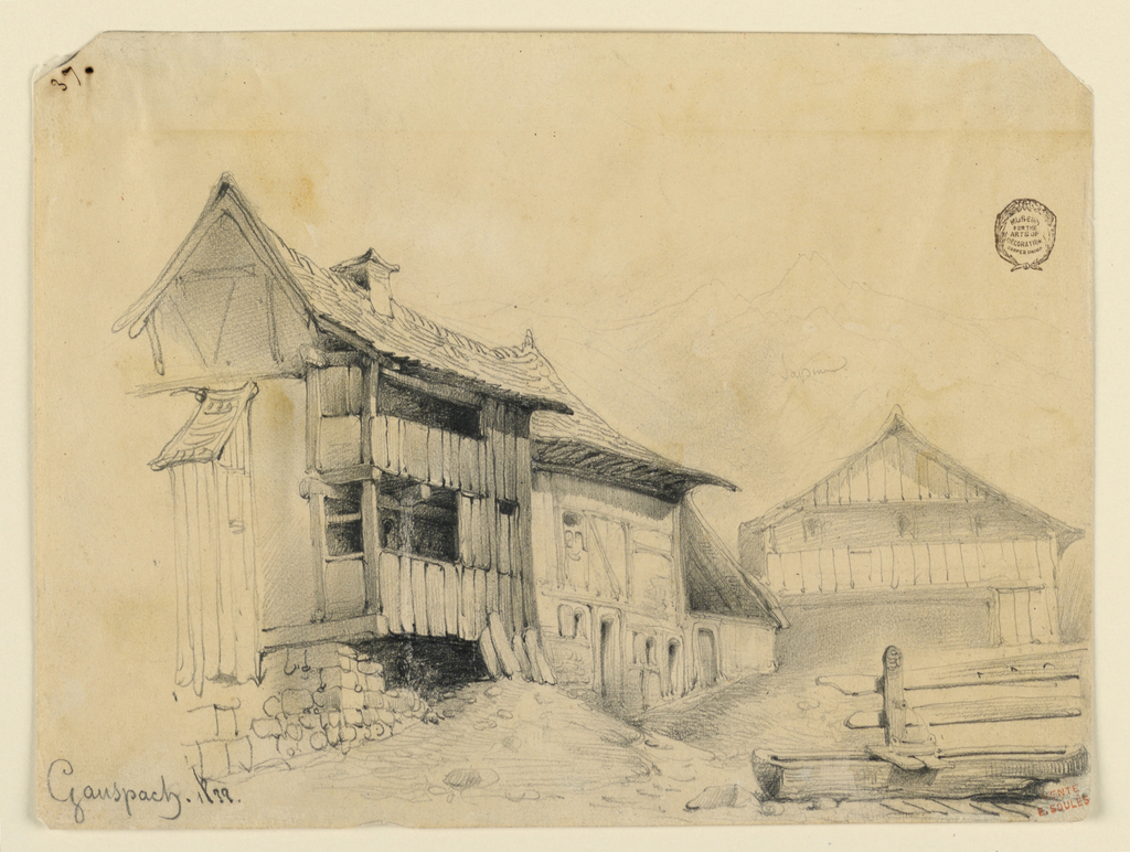Drawing, Old Farmhouses; Eugène Edouard Soulès (French, 1811–1876); France; graphite, black crayon on paper; 20.2 × 26.8 cm (7 15/16 × 10 9/16 in.); Gift of Eleanor and Sarah Hewitt; 1931-73-201