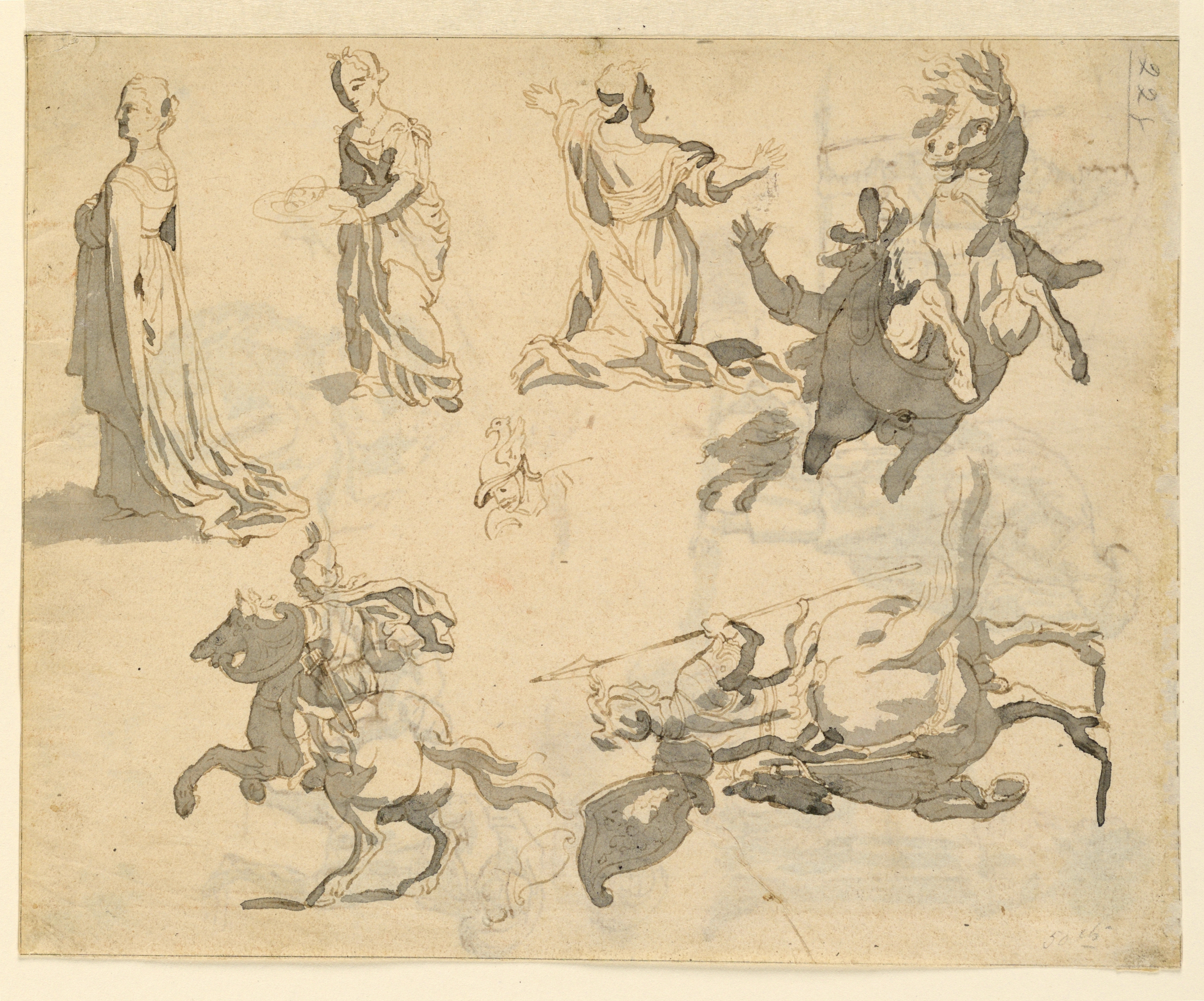 Drawing, Studies of Women, Kneeling Figure, and Figures on Horseback; France; pen and ink, brush and wash on paper; Gift of Eleanor and Sarah Hewitt; 1931-94-274