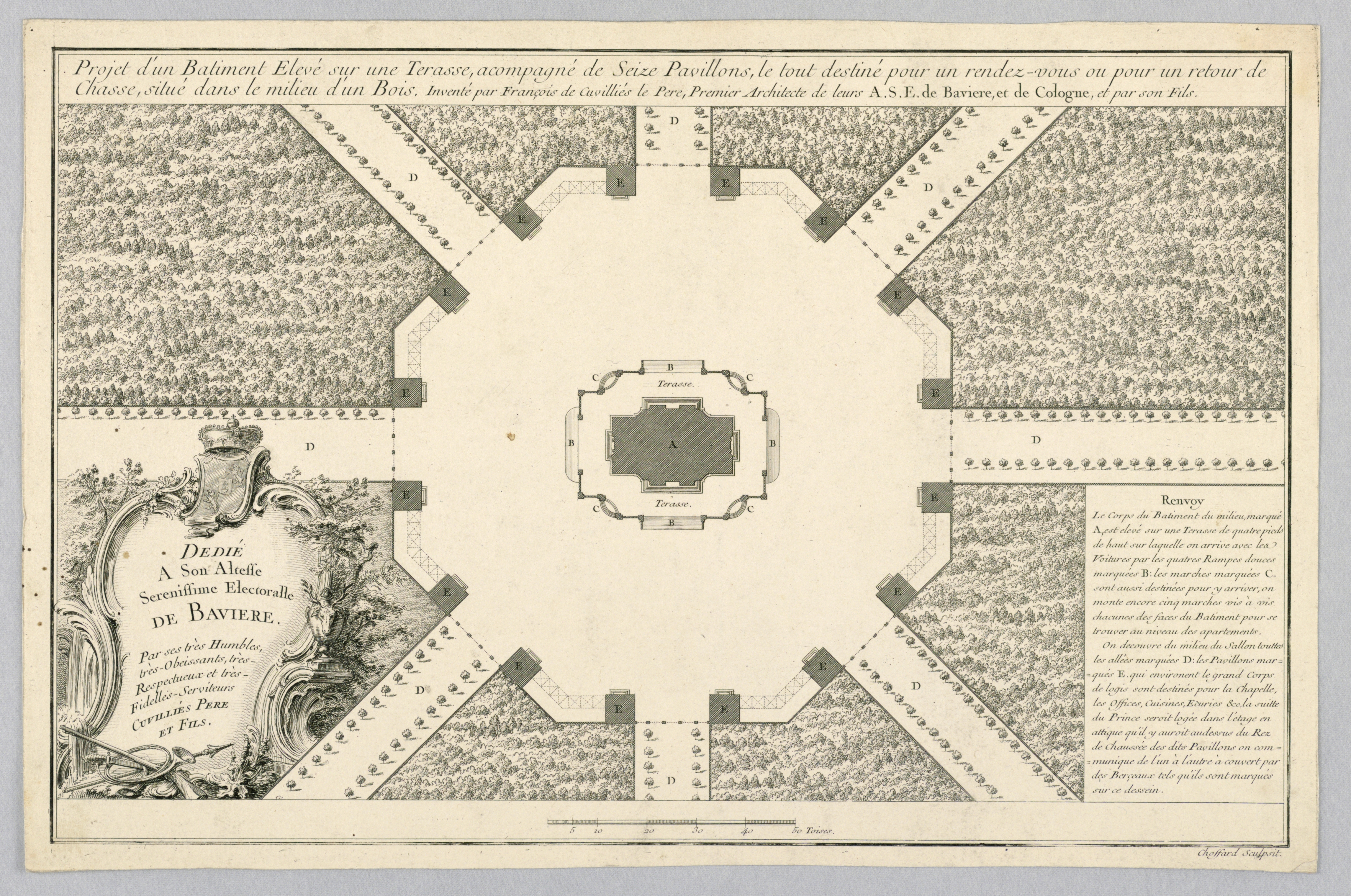 Print, Plan of a Hunting Lodge With 16 Wings; Designed by François de Cuvilliés the younger (German, 1731 - 1777), François de Cuvilliés the Elder (Belgian, active Germany, 1695 - 1768); Print Maker: P.P. Choffard; engraving on paper; Gift of Eleanor and Sarah Hewitt; 1931-94-585