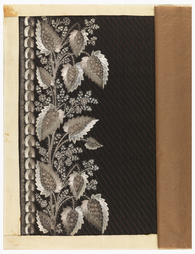 Embroidery Sample (France); silk, metallic thread, metal wire, sequins, paper; H x W: 30.2 x 18.5 cm (11 7/8 x 7 5/16 in.); Museum purchase from Au Panier Fleuri Fund; 1932-1-50