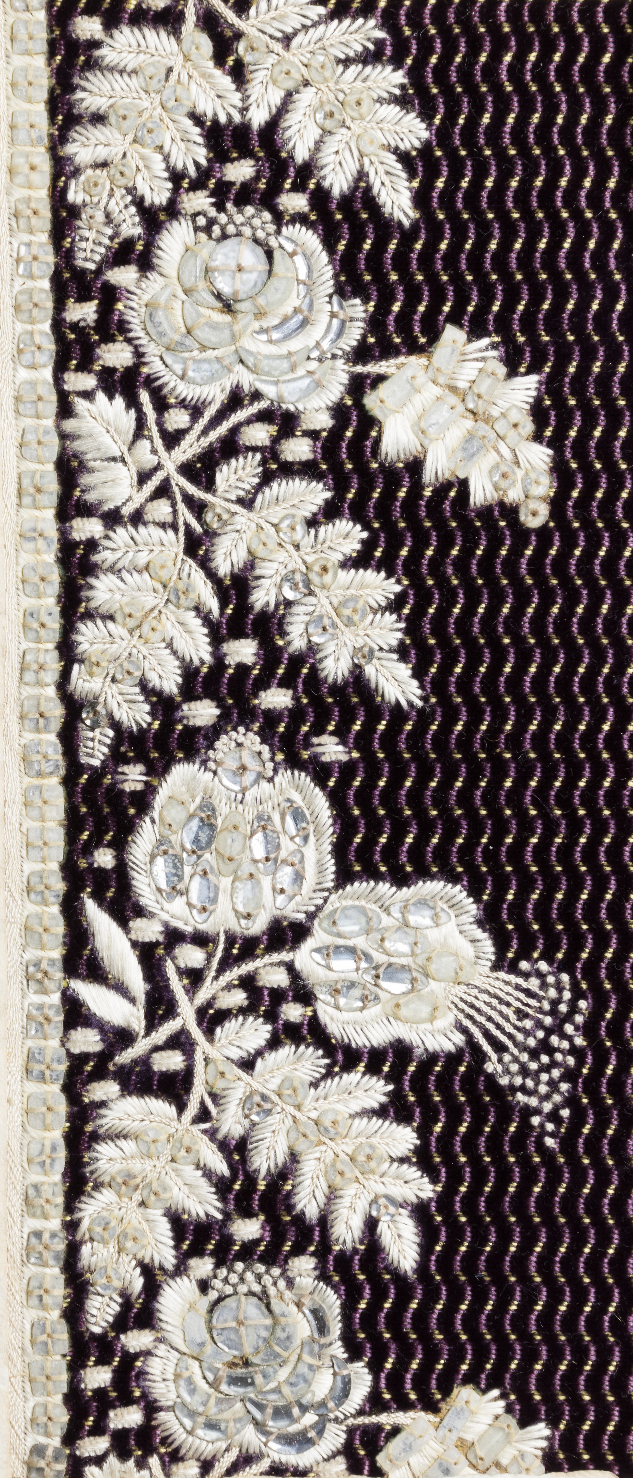This is a Embroidery sample. It is dated ca. 1775–1805 and we acquired it in 1932. Its medium is silk, glass, paper and its technique is embroidered on cut and voided supplementary warp pile in a compound foundation (velvet). It is a part of the Textiles department.