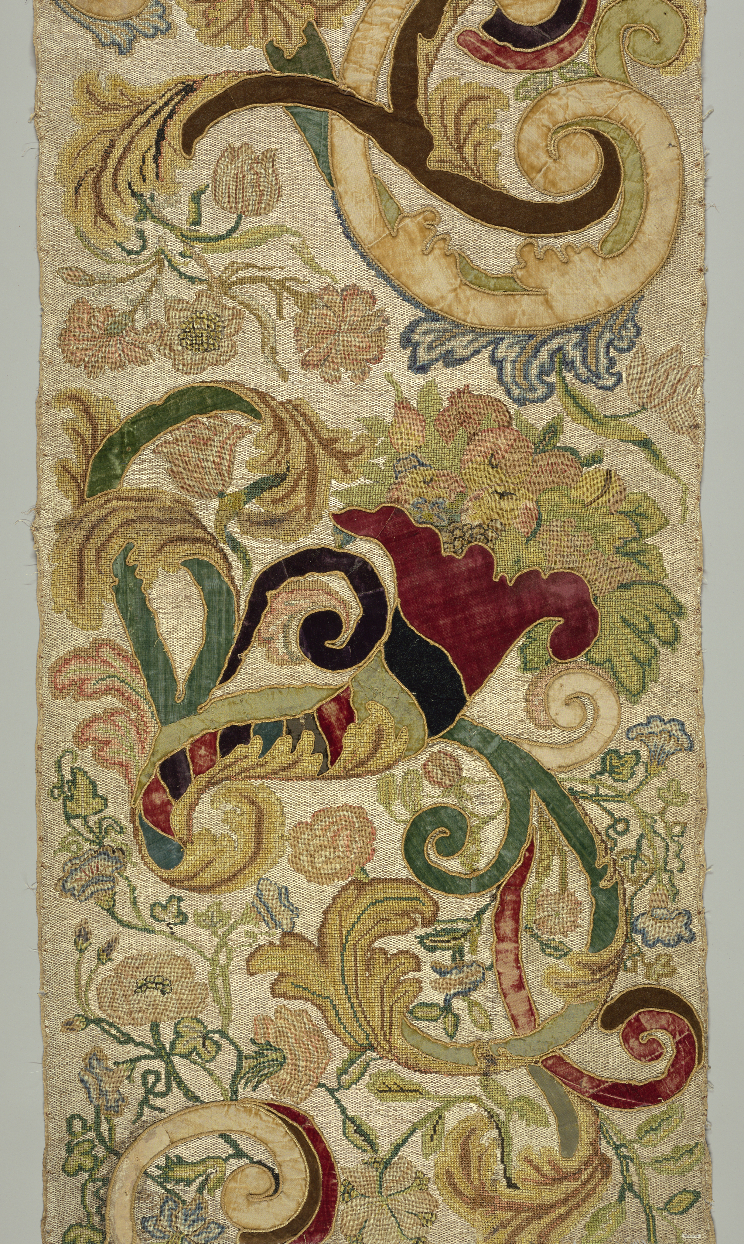 This is a panel. It is dated 17th century and we acquired it in 1932. Its medium is silk and velvet on canvas and its technique is embroidery using florentine stitch, cross stitch and petit-point; appliqué. It is a part of the Textiles department.