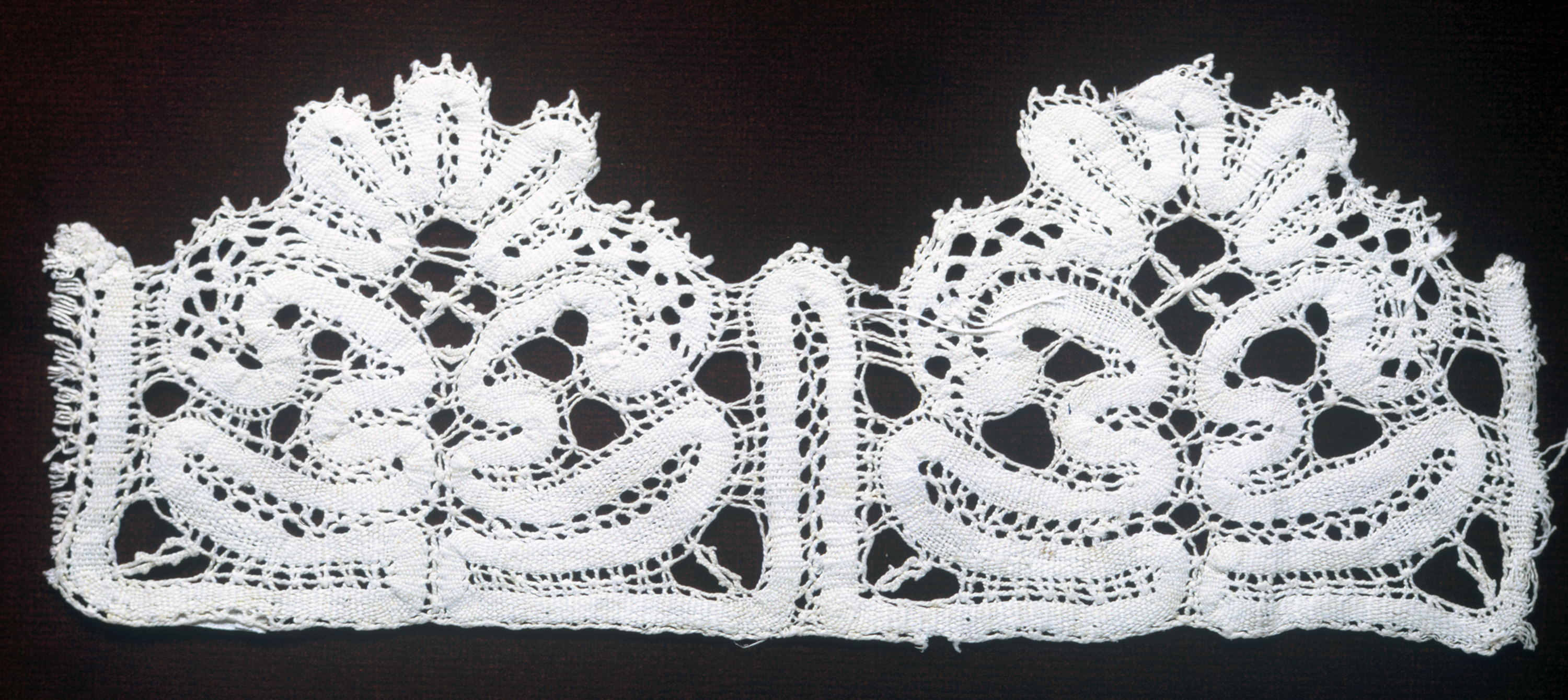 This is a Fragment. It is dated 17th century and we acquired it in 1933. Its medium is linen and its technique is bobbin lace, continuous tape with bars added. It is a part of the Textiles department.