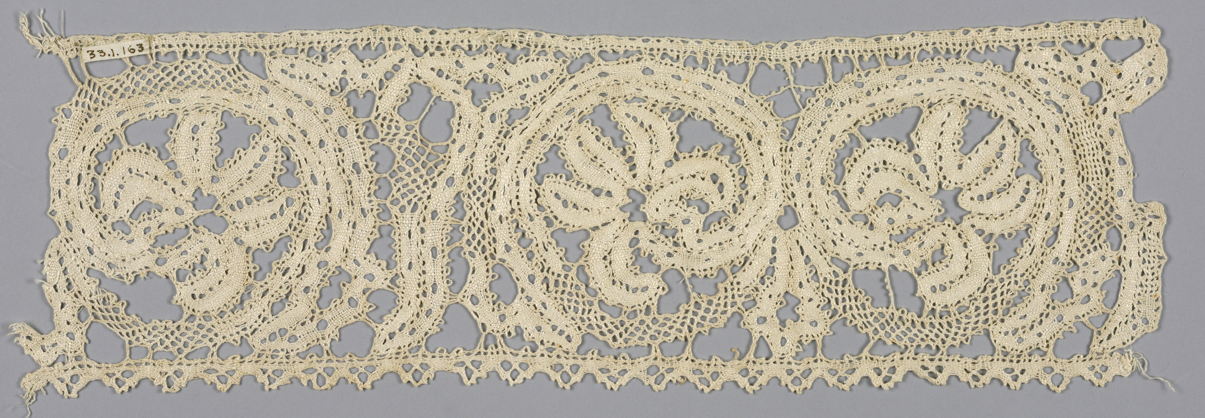 This is a Fragment. It is dated 19th century and we acquired it in 1933. Its medium is linen and its technique is bobbin lace, peasant style. It is a part of the Textiles department.