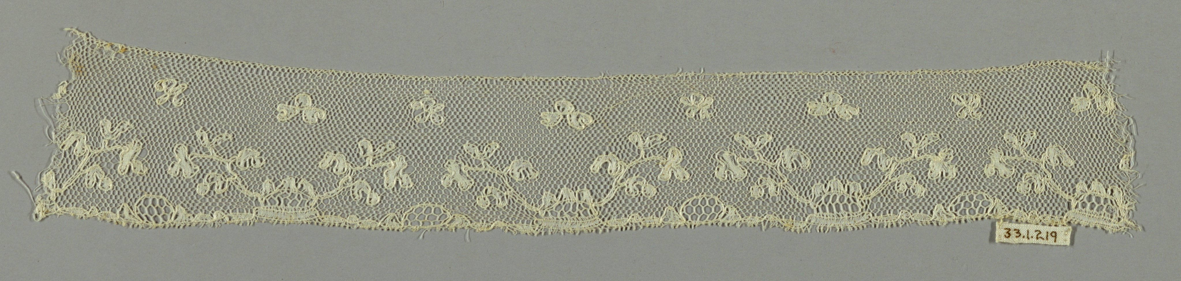This is a Fragment. It is dated 19th century and we acquired it in 1933. Its medium is linen and its technique is machine made. It is a part of the Textiles department.