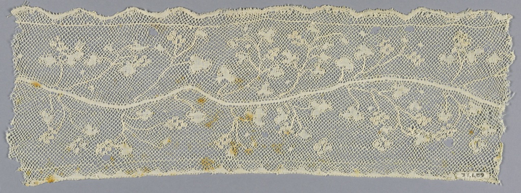 This is a Fragment. It is dated 18th century and we acquired it in 1933. Its medium is linen and its technique is bobbin lace made in lille style with heavy outline thread. It is a part of the Textiles department.