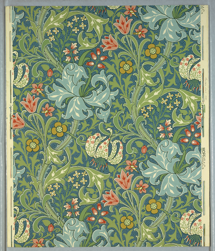 This is a Sidewall. It was designed by John Henry Dearle and manufactured by Jeffrey & Company. It is dated 1899 and we acquired it in 1935. Its medium is block-printed on paper. It is a part of the Wallcoverings department.