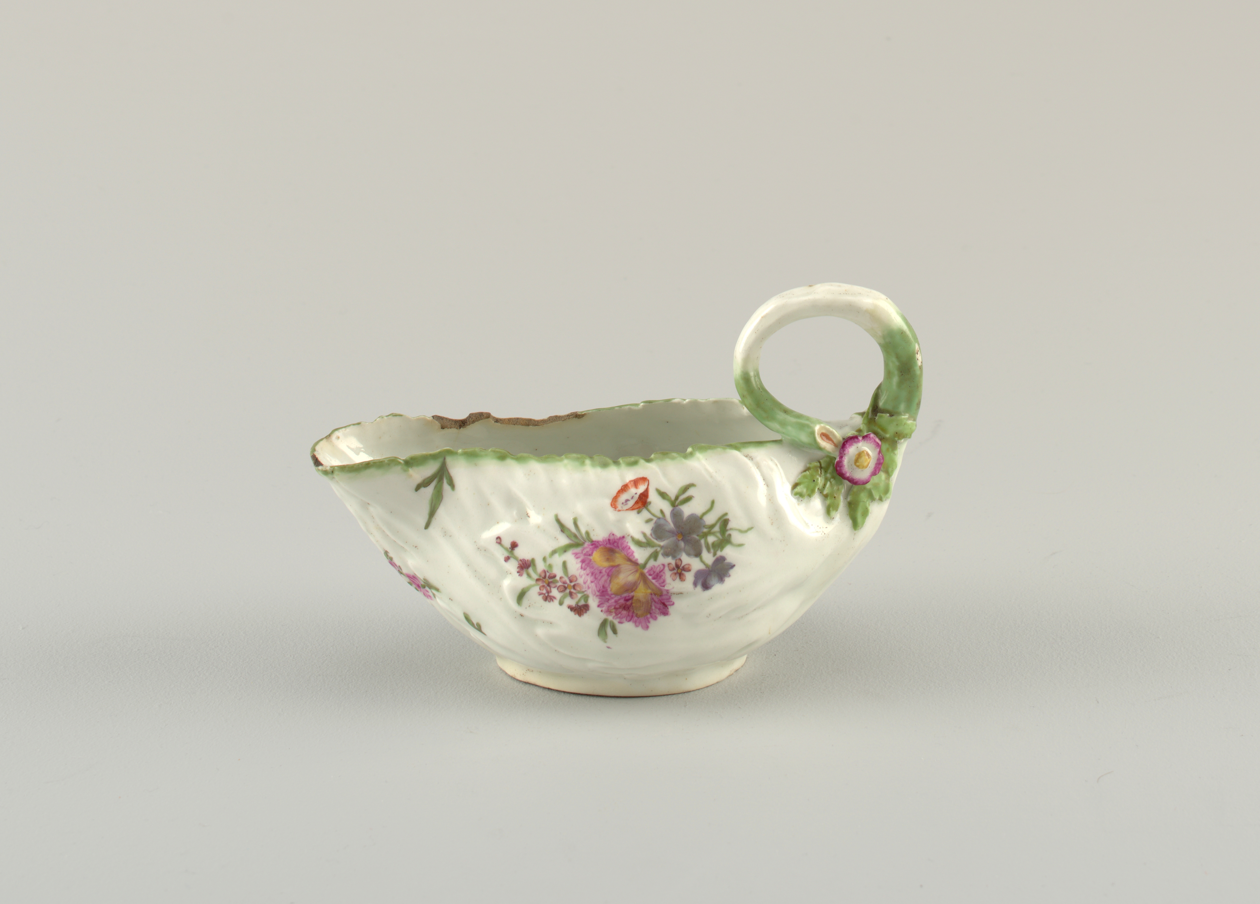 This is a sauceboat. It was probably Bow Porcelain Manufactory. It is dated ca. 1765 and we acquired it in 1936. Its medium is soft paste porcelain, vitreous enamel. It is a part of the Product Design and Decorative Arts department.