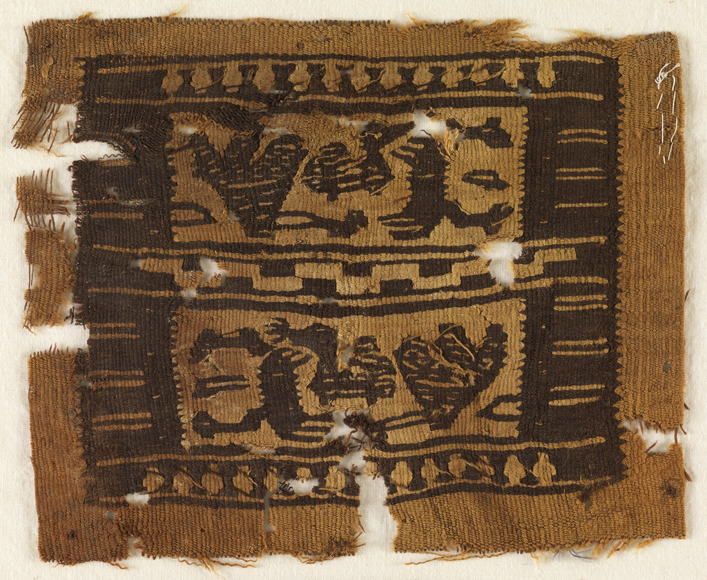 This is a Fragment. It is dated 6th century and we acquired it in 1936. Its medium is linen, wool and its technique is plain weave with discontinuous wefts (tapestry). It is a part of the Textiles department.
