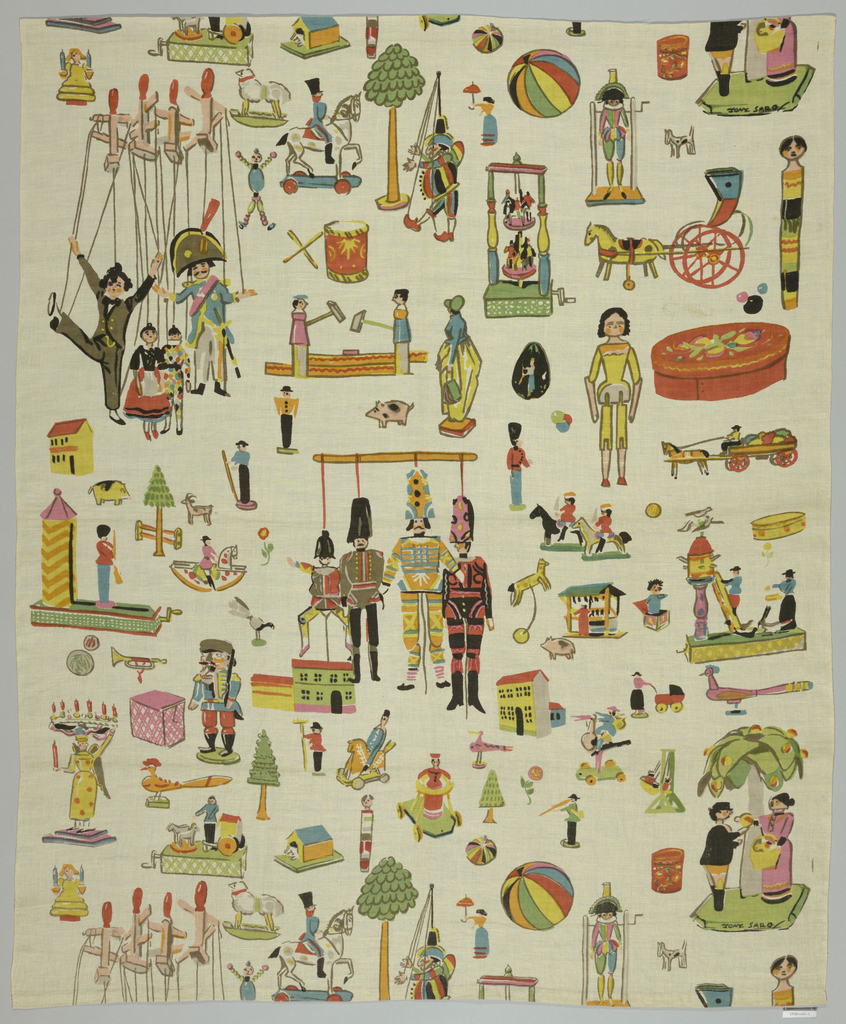 This is a Textile. It was designed by Tony Sarg. It is dated ca. 1935 and we acquired it in 1936. Its medium is linen and its technique is screen printed on plain weave. It is a part of the Textiles department.