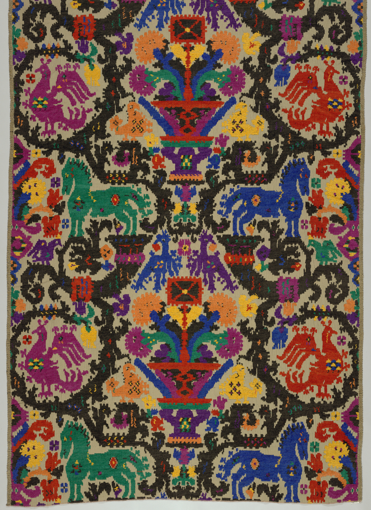 This is a Textile. It is dated ca. 1926 and we acquired it in 1936. Its medium is cotton and its technique is plain weave with brocading in chenille yarns. It is a part of the Textiles department.