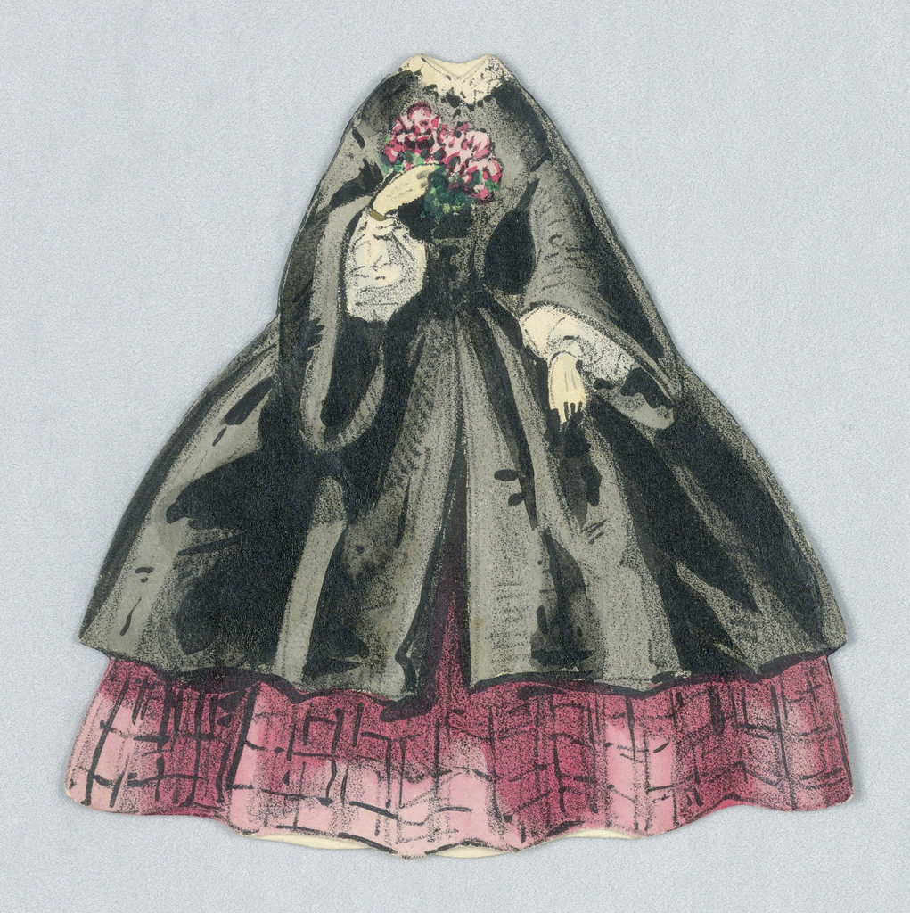 Print, Paper Doll Costume in Black over Checked Pink Skirt; USA; lithograph, brush and watercolor on cream heavy wove paper; H x W: 8 x 7.6 cm (3 1/8 in. x 3 in.), irregular; Gift of Grace Lincoln Temple; 1937-22-13
