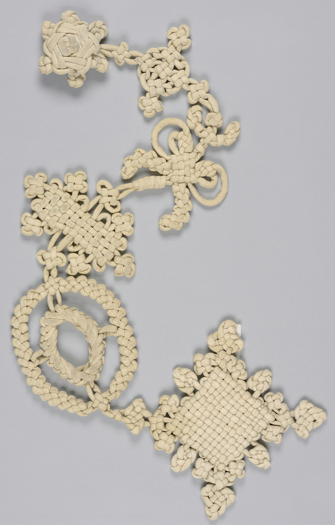 This is a Ornament. It was designed by Isidor Weinberg and made by Isidor Weinberg. It is dated early 20th century and we acquired it in 1937. Its medium is silk crepe mounted on velvet and its technique is knotted and braided. It is a part of the Textiles department.