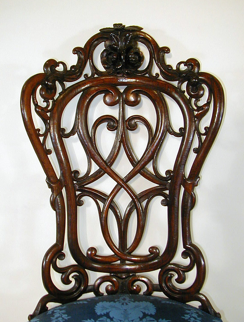 This side chair, formerly attributed to German-born American cabinetmaker John Henry Belter, illustrates the intricate, sensual design and curving back for which Belter was known and others imitated. In mid-nineteenth-century America, immigrant cabinetmakers were revitalizing aspects of decades- or even centuries-old European styles, such as the eighteenth-century French Louis XV rococo style with new techniques and new motifs. Rococo revival’s bold, undulating lines and luxurious materials—like this chair’s rosewood veneer—were emblematic of wealthy, fashionable mid-nineteenth-century American taste. While Belter received four patents for his innovative manufacturing techniques, others took advantage of them to produce similarly-styled works. These patents included improvements on bending wood laminated across grains – turning the otherwise brittle rosewood into a sturdy material – and a jigsaw apparatus that could intricately carve out backs, resulting in elegant, complicated designs of scrolls and floral motifs, such as those seen on this chair by a skilled follower or rival.