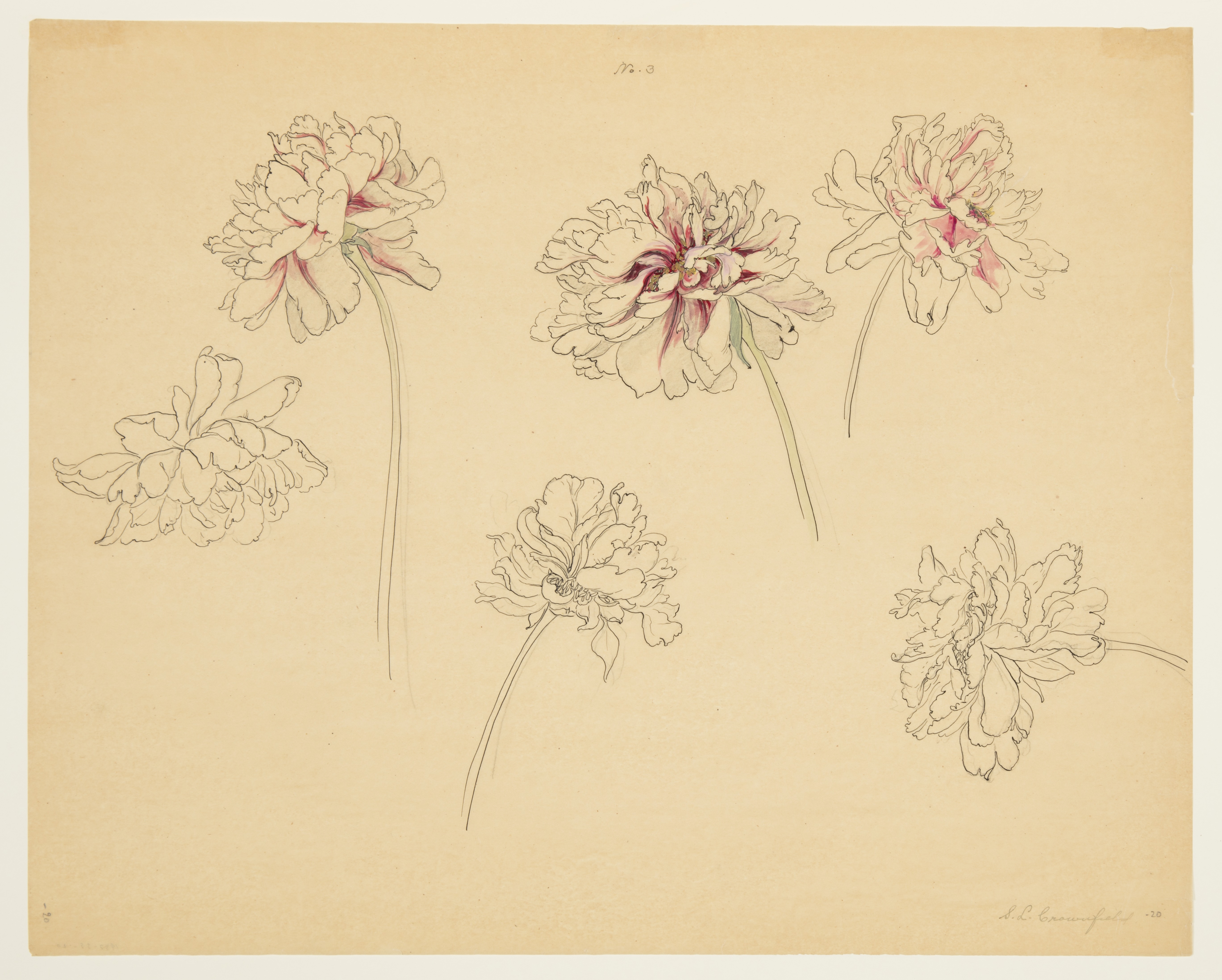 Drawing, Study of Peonies; Designed by Sophia L. Crownfield (American, 1862–1929); USA; pen and ink, graphite, brush and watercolor on tracing paper; 48.1 × 59.8 cm (18 15/16 × 23 9/16 in.) Mat: 55.9 × 71.1 cm (22 × 28 in.); Gift of Starling W. Childs and Ward Cheney; 1937-59-20