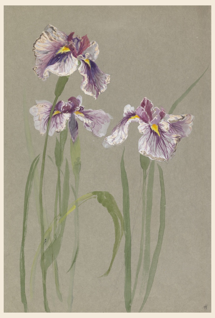 Drawing, Study of Irises; Designed by Sophia L. Crownfield (American, 1862–1929); USA; brush and watercolor on grey paper; 45.6 × 30.5 cm (17 15/16 × 12 in.); Gift of Starling W. Childs and Ward Cheney; 1937-59-39